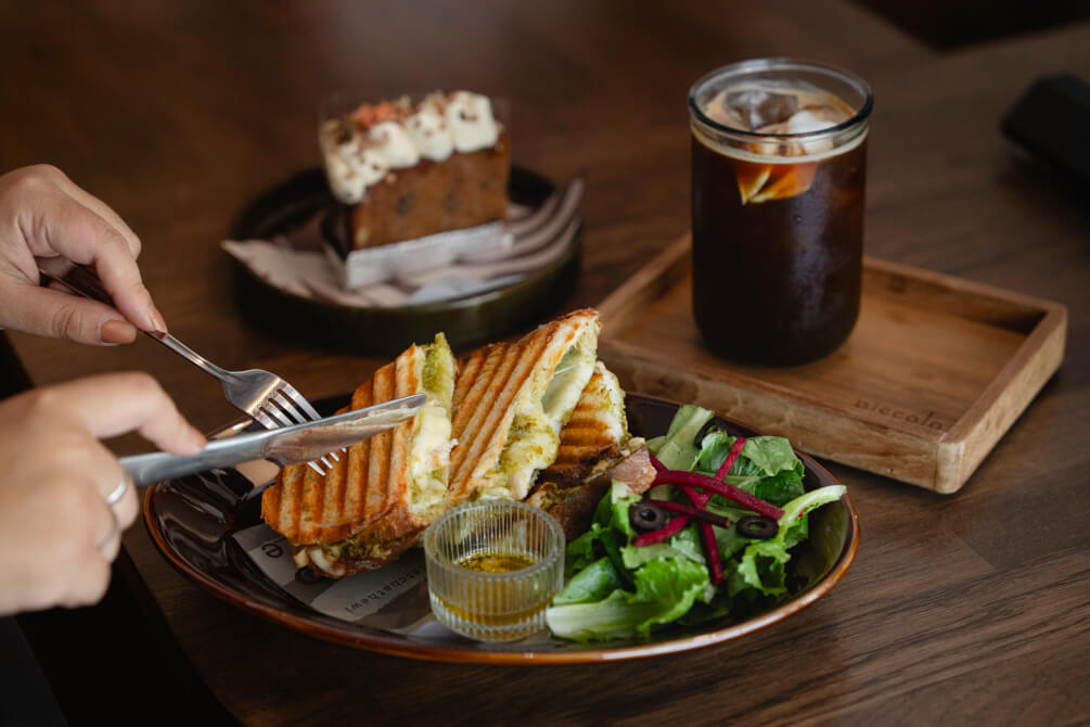 จุดเด่นของ Piccolo Vicolo Café อยู่ที่ความพิถีพิถันในทุกรายละเอียด ตั้งแต่การทำ Craft Syrup แบบโฮมเมด 100% จากวัตถุดิบธรรมชาติ ไปจนถึงการคัดสรรเมล็ดกาแฟ ทั้งเบลนด์หลัก 2 ตัว และการหมุนเวียน Single Origin ตามฤดูกาล ทำให้ทุกแก้วมีคาแรกเตอร์เฉพาะตัว สำหรับวันนี้เราเริ่มที่ Black Coconut (160 บาท) เมนู Local Twist ที่ใช้น้ำมะพร้าวแท้ 100% ไม่ผสมน้ำตาล ท็อปด้วยเอสเพรสโซช็อตเข้มข้น และ Hot Sandwich Chicken Pesto (240 บาท) แซนด์วิชอบร้อนสอดไส้ไก่รมควัน เพสโต้โฮมเมด และมอสซาเรลล่าชีส เสิร์ฟคู่สลัดผักสด เพิ่มความอร่อยแบบครบเครื่อง