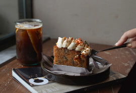 ปิดท้ายด้วย Carrot Cake (140 บาท) เค้กแครอทโฮมเมดเนื้อนุ่ม อัดแน่นด้วยธัญพืชเต็มคำ หนึ่งในเมนูยอดนิยมที่ใครมาก็ต้องลอง