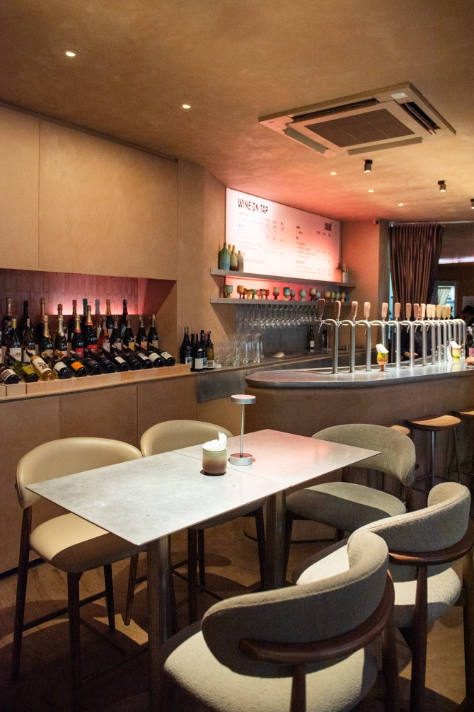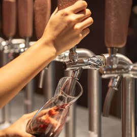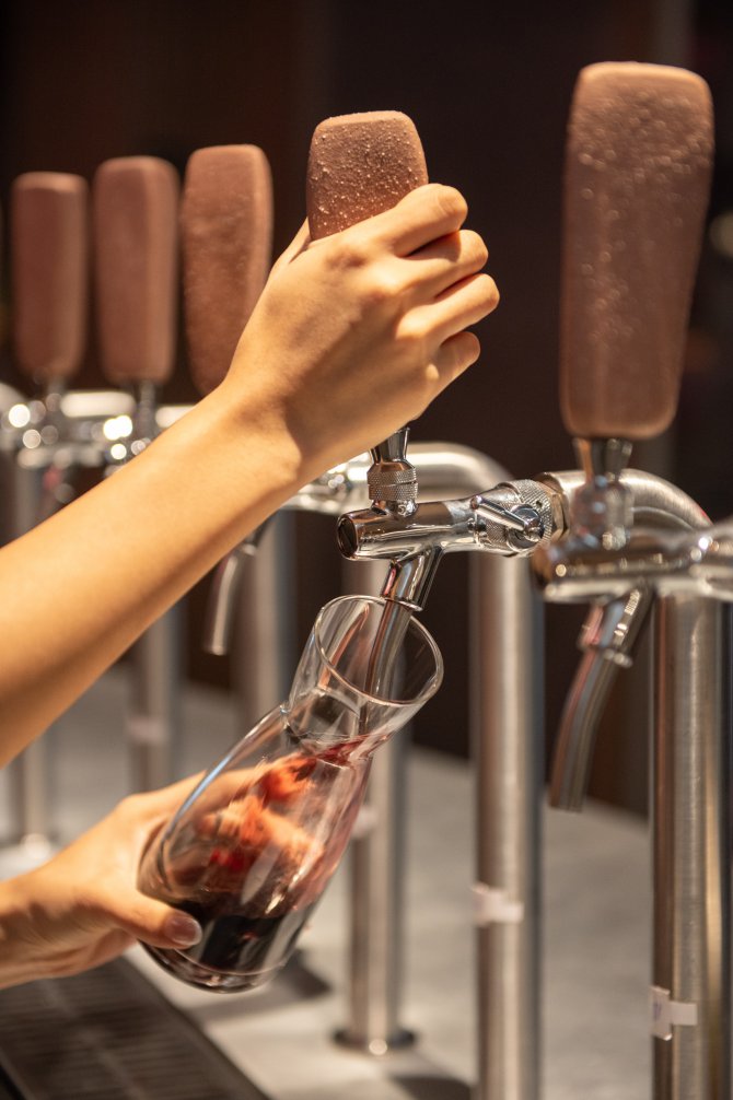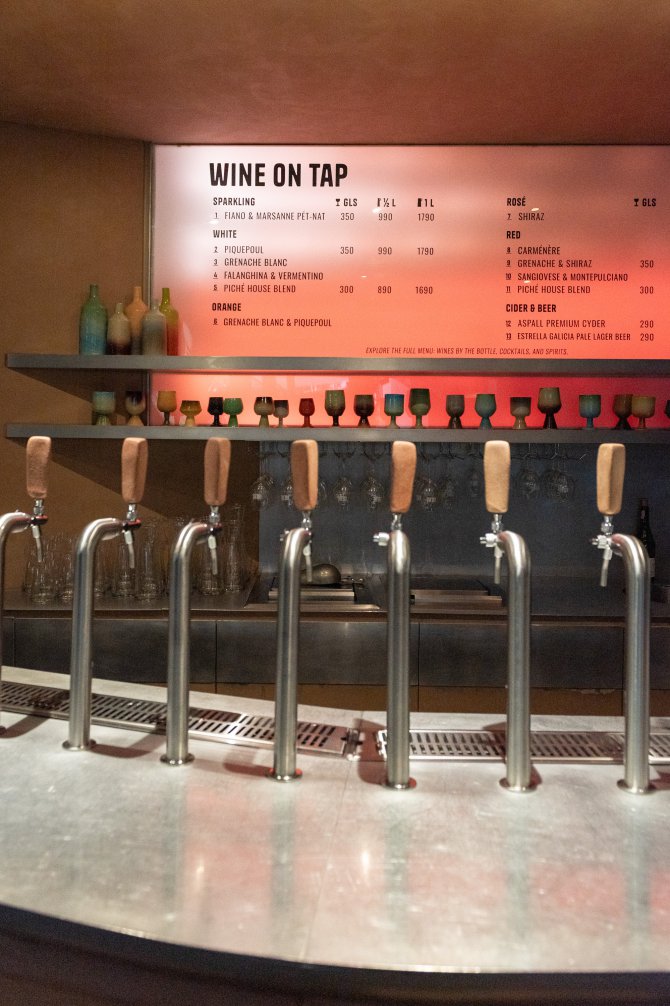 แน่นอนว่าสิ่งที่ทำให้ PICHÉ WINE BAR นั้นโดดเด่นและเป็นที่พูดถึงมากที่สุดก็คือ นวัตกรรม ‘Wine On Tap’ โดยเป็นไวน์บาร์แห่งแรกในประเทศไทยและในภูมิภาคเอเชียที่เสิร์ฟไวน์จากถังแท็ป คล้ายกับการเสิร์ฟเบีนร์ ซึ่งข้อดีของการเสิร์ฟไวน์ในลักษณะนี้คือการเป็นมิตรต่อสิ่งแวดล้อมอย่างยั่งยืน เพราะมีส่วนช่วยลดการใช้ขวดแก้วและสร้างมลพิษจากการผลิตขวดแก้ว ยิ่งไปกว่านั้นคือ ลูกค้าสามารถชิมไวน์ได้ทุกแท็ป ก่อนตัดสินใจสั่งมาดื่ม ไม่ว่าจะเป็นไวน์ขาว ไวน์แดง ออเรนจ์ไวน์ โรเซ่ สปาร์คกลิงไวน์ หรือแม้กระทั่งไซเดอร์และเบียร์ ทำให้มั่นใจได้ว่าเราจะได้ชิมไวน์ที่ให้รสชาติถูกปากถูกใจมากที่สุด ซึ่งในระหว่างที่เทสต์รสชาติไวน์นั้น นักดื่มไวน์ทั้งหลายยังจะได้รับคำแนะนำจากซอมเมอลิเยร์หรือผู้เชี่ยวชาญด้านไวน์อีกด้วย