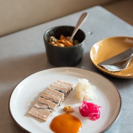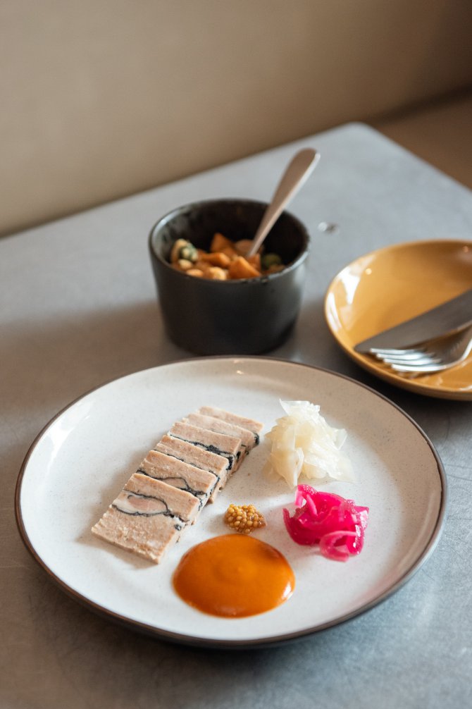 เมนูแนะนำจานแรกที่ไม่ควรพลาดคือ Pork Terrine (390 บาท) เซ็ตเมนูหมูกระทะในแบบฟิวชัน-ไฟน์ไดน์นิ่งที่เสิร์ฟมาพร้อมกับซอสพริกสูตรพิเศษ งาขาวคั่ว กะหล่ำปลีดอง หอมแดงดอง และมัสตาร์ดซีดที่ให้รสสัมผัสคล้ายกับคาเวียร์ ซึ่งพอลองรับประทานพร้อมกันแล้วจะต้องเซอร์ไพรส์ เพราะผสมผสานรสชาติออกมาได้กลมกล่อม คล้ายกับเมนูหมูกระทะอย่างไรอย่างนั้น