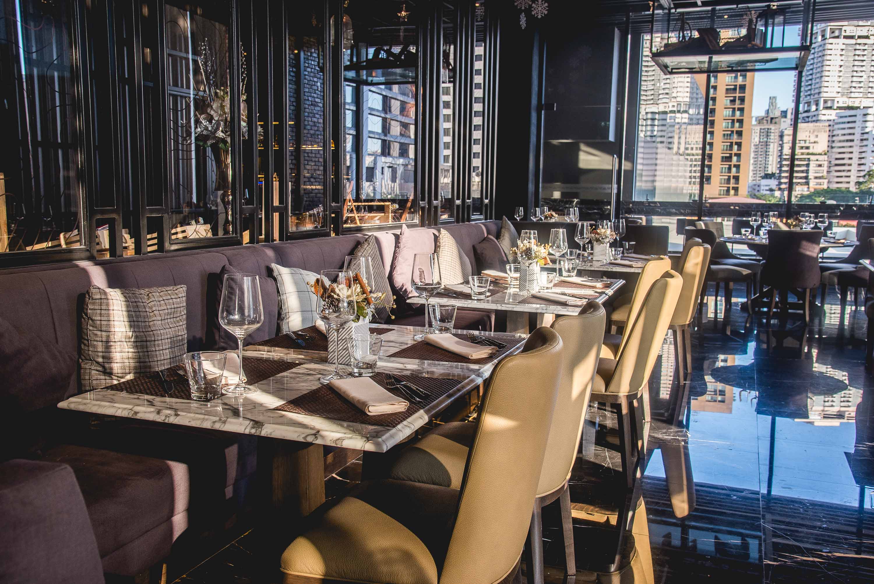 ตัวร้านตกแต่งในสไตล์อินดัสเทรียล โดยเน้นโทนสีดำ - เทา ผนังปูด้วยอิฐและประดับด้วยภาพและโปสเตอร์แบบวินเทจ โต๊ะหินอ่อนให้ความรู้สึกเรียบหรู ห้องอาหารแบ่งพื้นที่เป็นสองโซน โซนแรกจะติดกระจก เห็นวิวทิวทัศน์ที่สวยงามของย่านสุขุมวิท หากมาเร็วก็อาจทันชมพระอาทิตย์ตกพร้อมจิบไวน์ดี ๆ ซักแก้ว หรือถ้ามาตอนค่ำก็ได้บรรยากาศที่ดีไปอีกแบบ หากต้องการอากาศธรรมชาติ ก็สามารถเปิดประตูออกไปด้านนอก มีโต๊ะยาวพร้อมเก้าอี้ทรงสูงให้เลือกนั่งได้เช่นกัน
