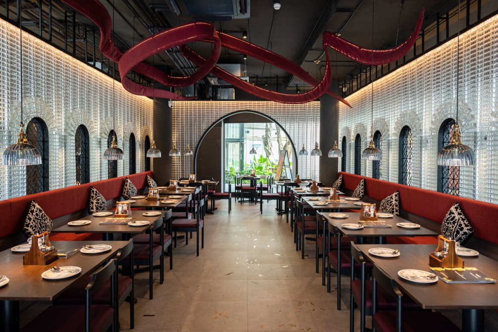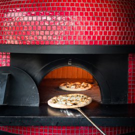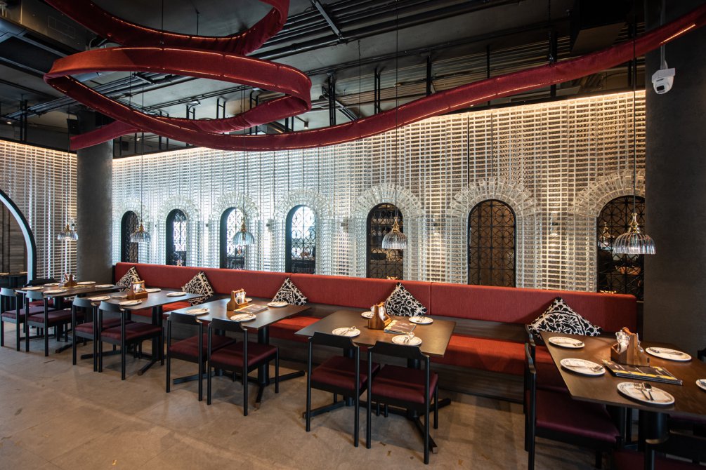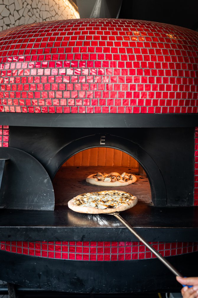 เรื่อยไปจนถึงการวาง CI สีประจำร้านในธีมดำ-แดง เพื่อเพิ่มความน่าสนใจให้เกิดภาพจำ อีกทั้งการดีไซน์รูปร่างของ element บนเพดานให้เป็นในลักษณะของเส้นพาสต้า Tagliatelle สีแดง อันเป็นสัญลักษณ์ของร้าน ตามมาด้วยดีเทลเล็ก ๆ อย่างลวดลายของเส้นพาสต้าชนิดต่าง ๆ ที่ฝังอยู่บนพื้นให้ได้ชวนว้าวไปกับความใส่ใจในทุกมุมมอง เคล้าด้วยกลิ่นหอม ๆ ของพิซซ่าอบใหม่ ๆ ที่ยังคอนเซ็ปต์เตาฟืนเอาไว้เช่นเดิม เพิ่มเติมมุมกระจกใส เผยให้เห็นเบื้องหลังบรรยากาศการรังสรรค์ความอร่อยหลังครัวทั้งการอบพิซซ่าและการทำพาสต้าเส้นสดของทีมเชฟอย่างใกล้ชิด