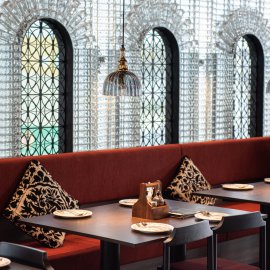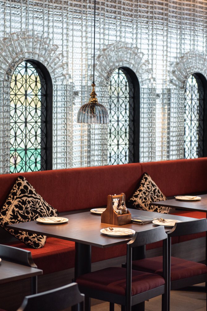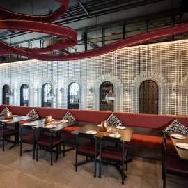 ความโดดเด่นของงานดีไซน์สถาปัตยกรรมและตกแต่งภายในร้าน ได้แรงบันดาลใจ ไอเดียตั้งต้นมาจาก ‘โบสถ์คริสตจักร’ สมัยโบราณ ซึ่งทางร้านได้มีการนำเสนอเรื่องราว สอดแทรกรายละเอียดที่บ่งบอกถึงความเป็นสถาปัตยกรรมอิตาลีเอาไว้ทุกกระเบียดนิ้ว นับตั้งแต่ซุ้มประตูทางเข้าร้านที่มีความโค้งมน การเลือกใช้ม่าน เลือกใช้วัสดุบล็อกแก้วมาจัดเรียงเป็นแนวกำแพงร้านอย่างพิถีพิถัน ดูแปลกตาโออ่าไม่เหมือนที่ไหน อีกทั้งลวดลายฉลุเหล็กดัดสีดำที่ถอดแบบมาจาก Stained Glass หรือโครงสร้างโบสถ์ยุคสมัยนั้น พร้อมจำลองรูปแบบการก่อสร้างท่อส่งน้ำภายในกำแพงวิหาร ตามหลักการออกแบบอาคารสถาปัตยกรรมที่มักพบเห็นในอิตาลีก็ได้ถูกหยิบยกมาไว้ที่ร้านได้อย่างกลมกลืนและอลังการ ให้ความรู้สึกเหมือนกำลังนั่งทานอาหารอยู่ในโบสถ์จริง ๆ