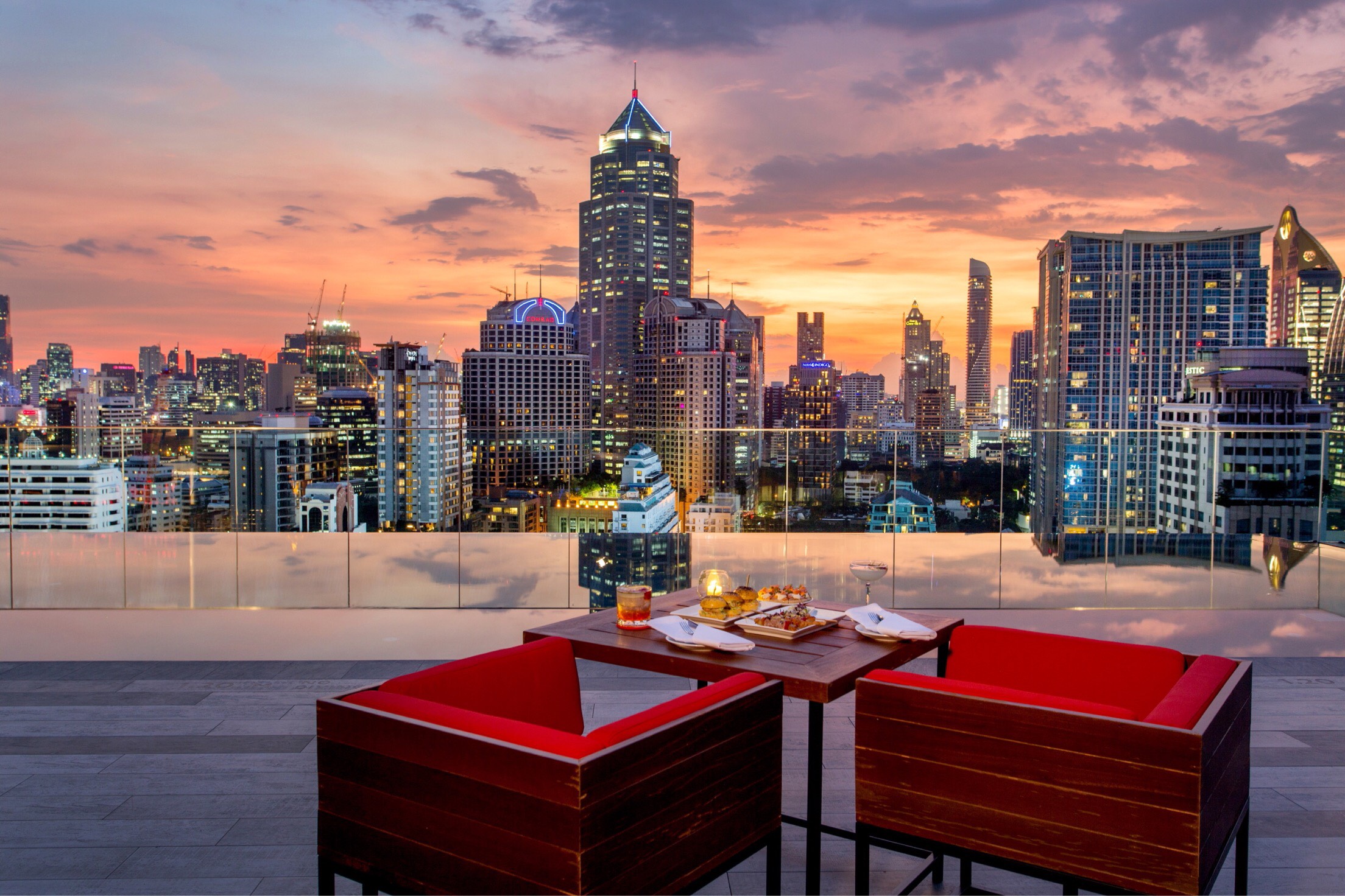 เมื่อขึ้นมาถึงด้านบน ทุกคนจะต้องประทับใจกับบรรยากาศสวย ๆ ที่ถูกตกแต่งด้วยเฟอร์นิเจอร์ที่เน้นใช้สีแดงตามชื่อของรูฟท็อปบาร์ โดดเด่นด้วยสระว่ายน้ำที่เป็น Pool Bar ในช่วงกลางวัน ส่วนกลางคืนจะให้ความสวยงามของแสงไฟที่สาดกระทบกับผิวน้ำ เหมาะกับการมาเดทท่ามกลางวิวสุดโรแมนติกกับคนพิเศษ