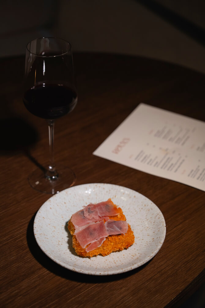 ตามมาด้วยอีกหนึ่งจานน่าลองของหมวด Bites อย่างเมนู Prosciutto Korokke (280 บาท / 2 ชิ้น) เมนูโครเกต์ (Croquette) ที่ทำจากพาร์มาแฮม พร้อมการสร้างสรรค์ความอร่อยในสไตล์ญี่ปุ่นที่ผสมเข้ากับความเป็นโครเกต์แท้ของทางฝรั่งเศส ออกมาเป็นโครเกต์ที่ให้ความครีมมี่และกลิ่นมันฝรั่งหอม ๆ