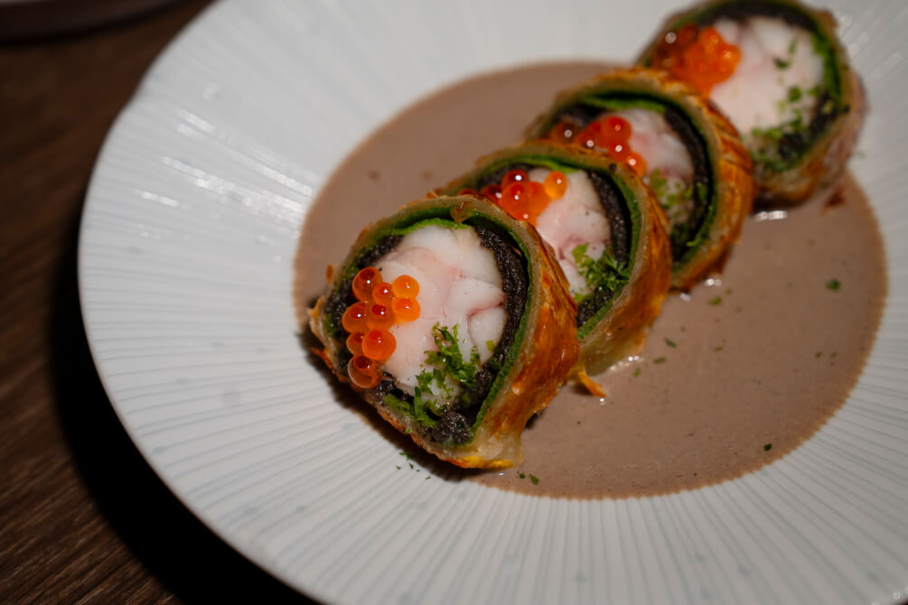 หรือจะเป็น Grouper Wellington (620 บาท) เมนูเวลลิงตันสุดสร้างสรรค์ที่ตามปกติแล้วจะใช้วัตถุดิบเป็นสเต๊กเนื้อเทนเดอร์ลอยน์ แต่ทางร้านได้เลือกนำเนื้อปลาเก๋ามาเป็นวัตุดิบหลักสำหรับสอดไส้แป้ง พร้อมปรับส่วนผสมเล็กน้อยจากผักบดมาเป็นผักเคลและมูสเห็ด เพื่อเสริมความชุ่มฉ่ำให้กับเท็กซ์เจอร์ของเนื้อปลาเก๋ามากขึ้น พร้อมซอสที่ทำจาก ‘ดาชิ’ ให้ได้สัมผัสถึงกลิ่นอายความเป็นอาหารญี่ปุ่น