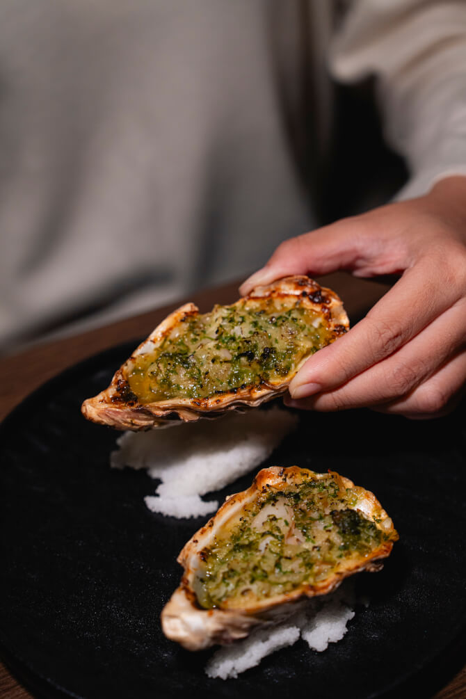 สำหรับครั้งนี้ทางร้านเลือกเสิร์ฟความอร่อยเรียกน้ำย่อยกันด้วยหมวด Bites กับเมนู Escargot (360 บาท / 2 ชิ้น) โดยเมนูนี้เชฟได้แรงบันดาลใจมาจาก Escargot หรือเมนูหอยทากสุดคลาสสิกที่หลายคนอาจคุ้นเคย ก่อนที่จะปรับวัตถุดิบและส่วนผสมมาใช้ Cafe de Paris Butter อบคู่กับหอย Subukai หรือ Tsubugai ซึ่งเป็นหอยสังข์ญี่ปุ่น วัตถุดิบยอดนิยมของวงการอาหารญี่ปุ่น ให้เนื้อสัมผัสที่กรุบกรอบและรสชาติหวานเล็กน้อย เป็นการครีเอตเมนู Escargot ที่ทั้งอร่อยและสร้างความแปลกใหม่ไปพร้อม ๆ กัน