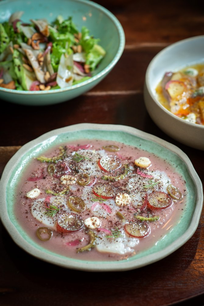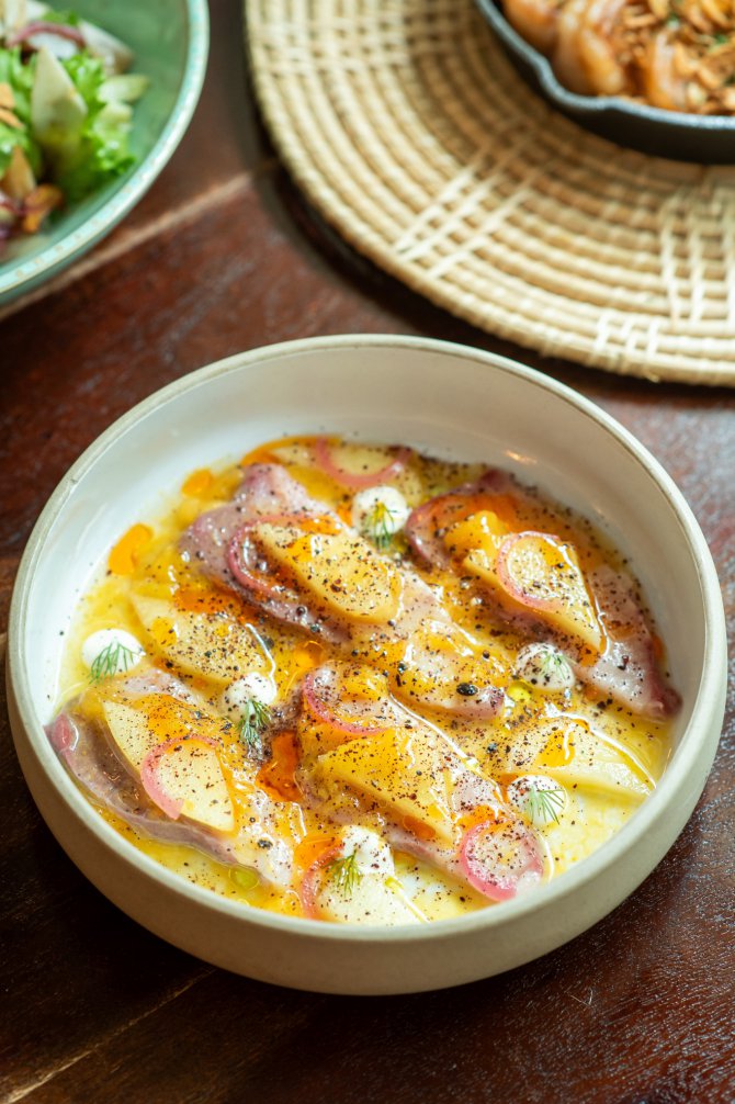 Hola Ceviche (360 บาท) เมนู Ceviche ที่ผสานรสชาติอย่างมีมิติ โดยมีส่วนประกอบของ Dressing จากเสาวรส มะม่วงสุก และสับปะรดหอมสุวรรณ ซึ่งเป็นการนำผลไม้เมืองร้อนของไทยมาให้รสชาติเปรี้ยวหวานในสไตล์ละติน, Tartare Dot ส่วนผสมที่ใช้ผักดองของไทยมาทำเป็นทาทาร์ ด้านบนประดับด้วยแอปเปิ้ลที่นำมาโพชในสไตล์แบบเมดิเตอร์เรเนียน เสริมด้วยหอมดอง และ Sumac ซึ่งเป็นผลไม้แห้งคล้ายเบอร์รีที่นิยมทานกันในหมู่ชาวเมดิเตอร์เรเนียน พร้อมด้วยน้ำมันปรุงรสที่สกัดจากสมุนไพรไทยต่าง