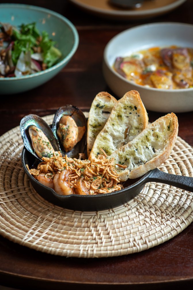 ต่อเนื่องความอร่อยด้วยเมนู Seafood Gambas Hot Pan (260 บาท) กุ้งผัดน้ำมันมะกอกสูตรเข้มข้น โดยความพิเศษของจานนี้อยู่ที่การใส่น้ำเคยและมันกุ้งลงไปด้วย เพื่อให้น้ำซอสมีรสเข้มข้นกลมกล่อมมากยิ่งขึ้น
