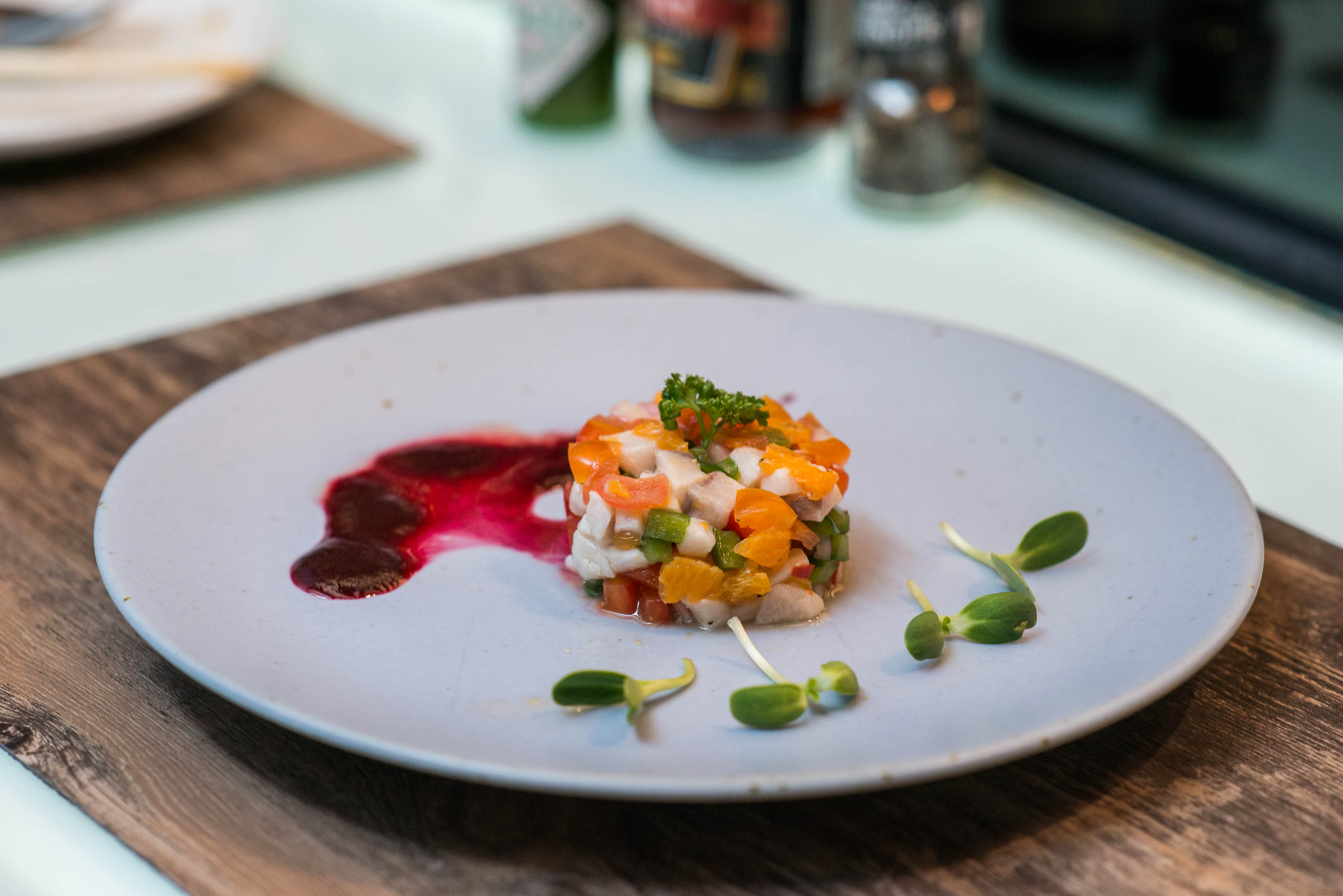 เริ่มกันที่เมนูแรกที่ทางร้านแนะนำอย่าง Cobia Crudo (350 บาท) ปลาช่อนทะเลสด ๆ ที่นำมาสไลซ์เป็นชิ้นบาง ราดด้วยซอสรสเปรี้ยวเผ็ดสูตรเฉพาะของทางร้าน