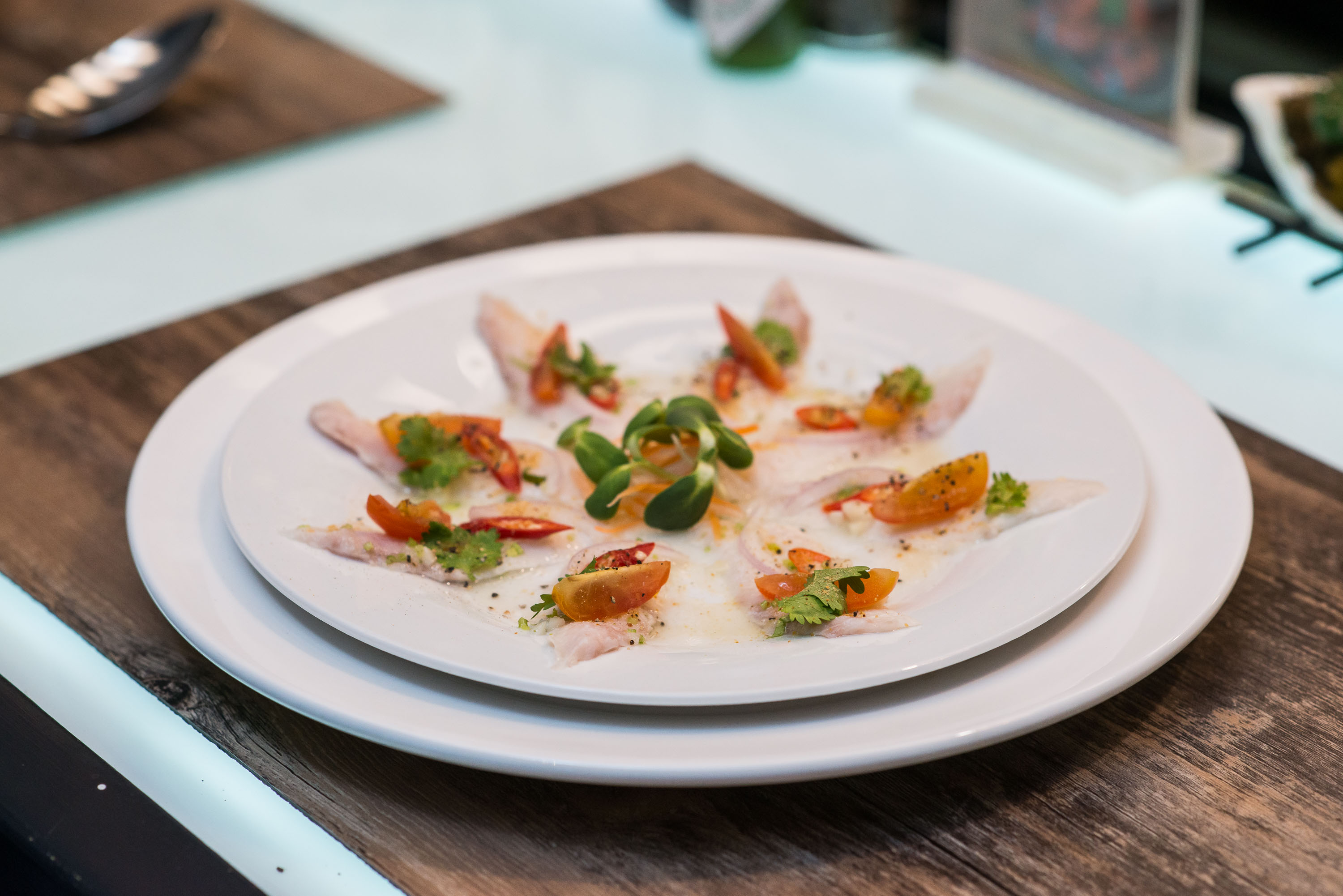 เริ่มกันที่เมนูแรกที่ทางร้านแนะนำอย่าง Cobia Crudo (350 บาท) ปลาช่อนทะเลสด ๆ ที่นำมาสไลซ์เป็นชิ้นบาง ราดด้วยซอสรสเปรี้ยวเผ็ดสูตรเฉพาะของทางร้าน