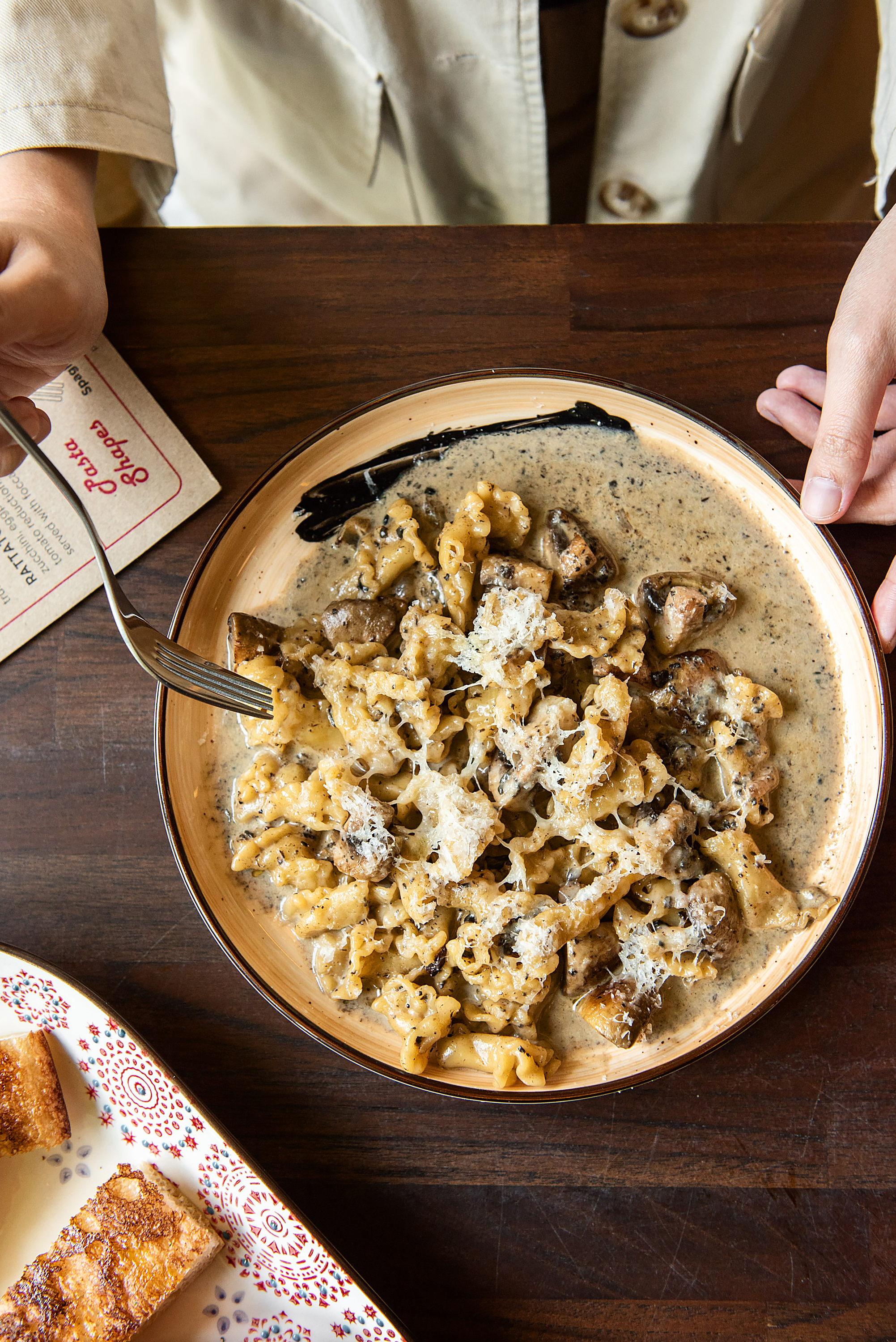มาถึงเมนูพาสต้า Signature ของทางร้านอย่าง Truffle Cream (265 บาท) พาสต้าเส้น Gigli ที่มีความหนึบและเหนียวนุ่มกำลังดี ผสานรสชาติแสนครีมมีด้วยครีมซอสทรัฟเฟิลที่ทางร้านเคี่ยวมาอย่างพิถีพิถัน เสริมความอร่อยด้วย Parmesan Cheese และเห็ดแชมปิญอง ก่อนจะเพิ่มความเข้มข้นด้วย Smoky Black Ink Aioli ที่ช่วยชูรสชาติให้จานนี้พิเศษมากยิ่งขึ้น