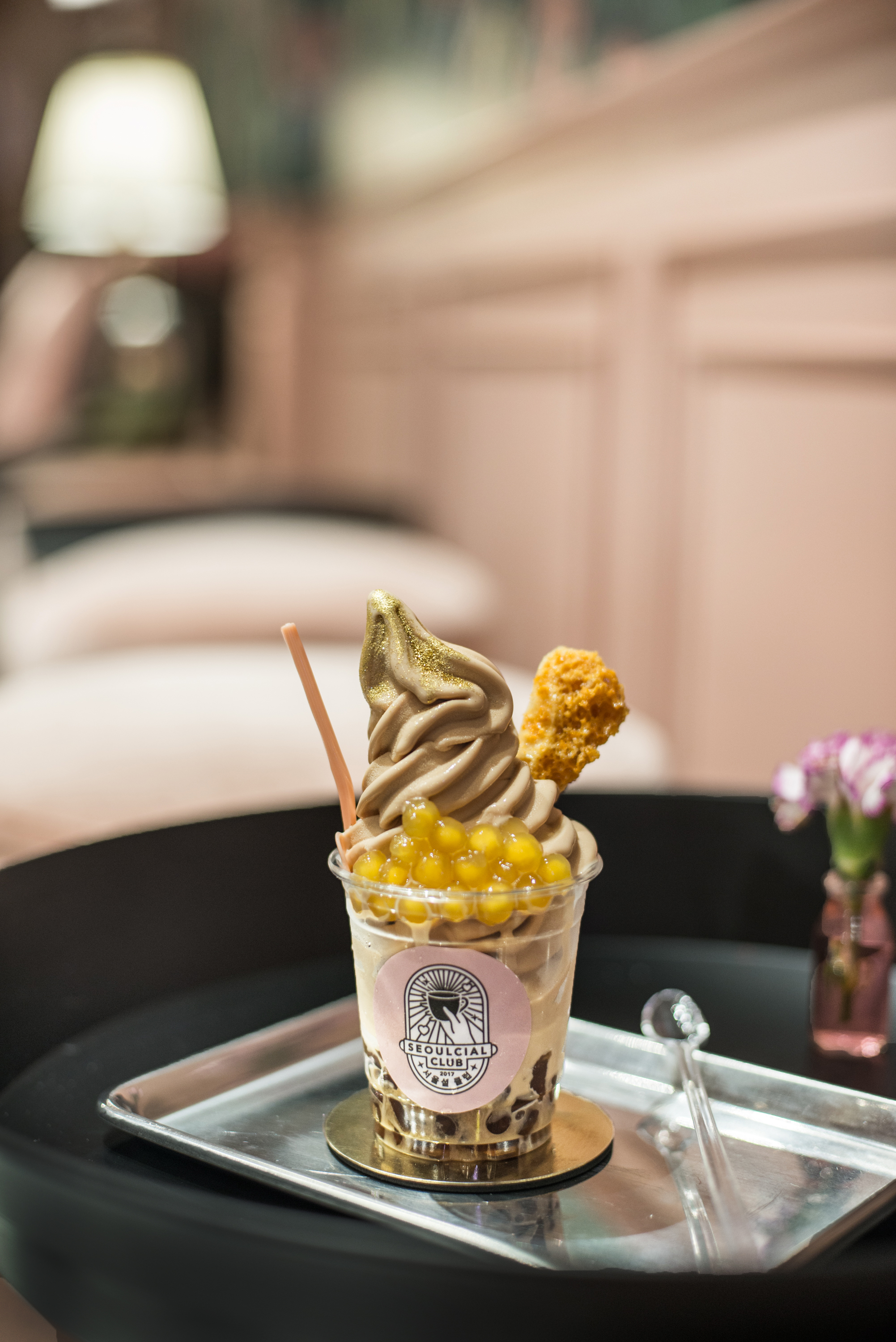 เมนูทั่วไปจะเป็นขนมหวานและไอศกรีมซอฟต์เสิร์ฟที่ได้สูตรการทำมาจากเกาหลี ใครที่เพิ่งเจอกับอากาศร้อน ๆ ลองสั่ง Golden White Truffle (280 บาท) ไอศกรีมซอฟต์เสิร์ฟรสเห็ดทรัฟเฟิล ใส่คอนเฟลกกับถั่วบดโฮมเมดเพื่อให้ได้ความหวาน กรุบกรอบ ตกแต่งด้วยผงทองคำระยิบระยับ รสชาติหวานปนเค็มนิด ๆ ตัดเลี่ยน หรือถ้าไม่ชอบกลิ่นทรัฟเฟิลอาจจะสั่งเป็น Bubble Milk Tea (190 บาท) ไอศกรีมซอฟต์เสิร์ฟรสชานม ทานพร้อมกับเจลลี่ ไข่มุกสีทองหนึบ ๆ และรังผึ้ง ใครที่เบื่อชานมไข่มุกแก้วเดิม ๆ แนะนำให้ลอง