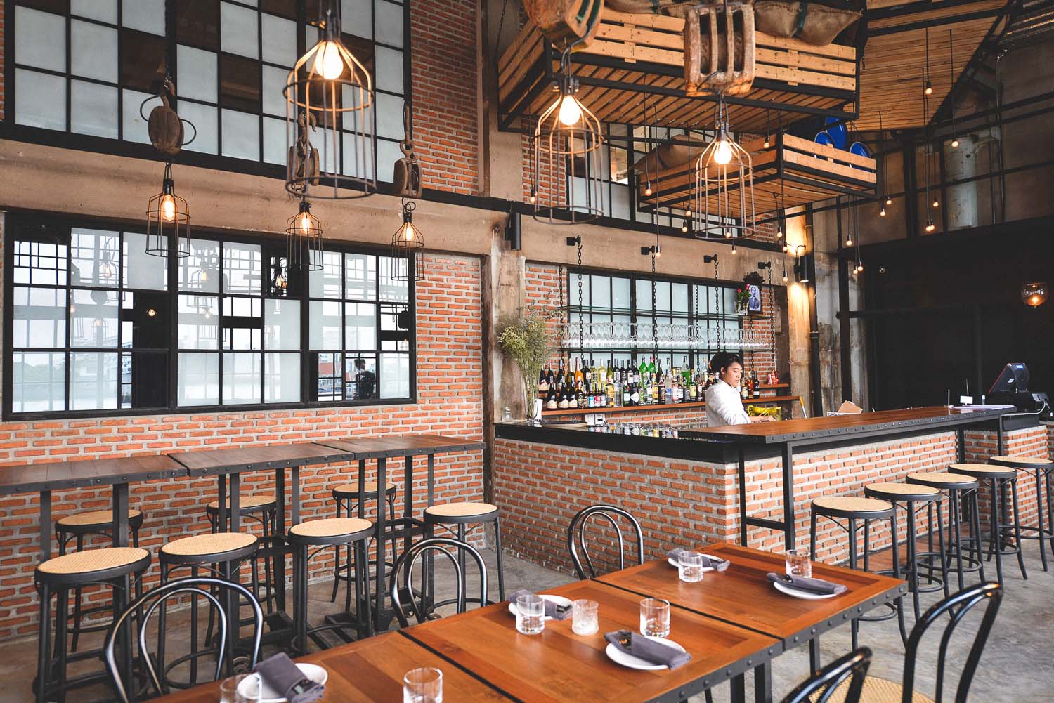 จากเดิมที่เป็นอู่ต่อเรือ เลยปรับเปลี่ยนร้านให้อิงกับแนวเดิม แบบ Industrial Style ดูเท่มีสไตล์ ด้วยกำแพงอิฐบล็อก ใช้ตะขอต่อเรือมาเกี่ยวกับโคมไฟ พร้อมเปิดเผยโครงเหล็กและแผ่นไม้ให้ดูเข้ากับบรรยากาศโดยรอบ พร้อมสื่อมาถึงรูปแบบอาหารที่เน้นใช้วัตถุดิบซีฟู้ดมาทำให้เข้ากับทำเลที่ตั้งริมน้ำ