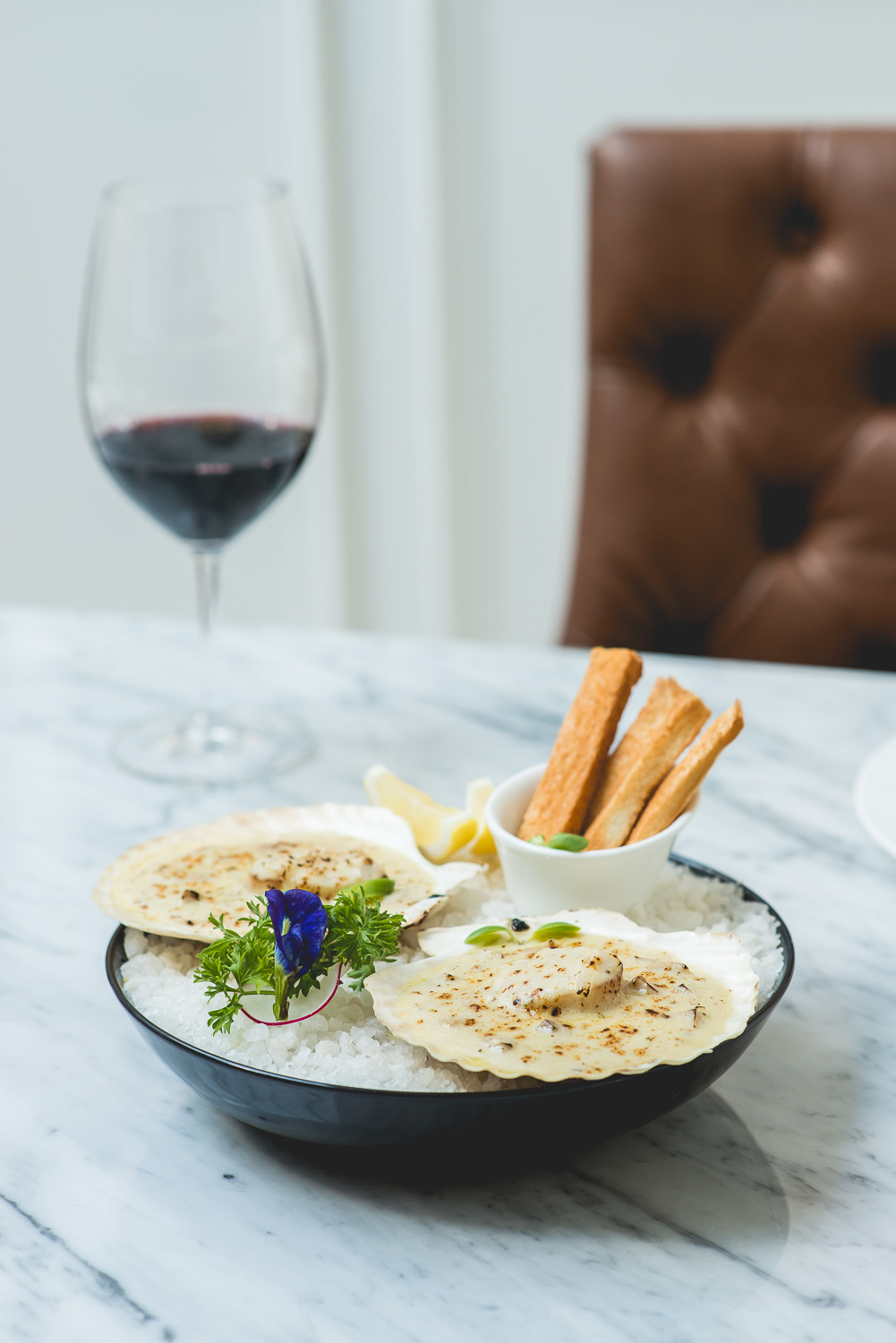 หรือลองสั่ง Hokkaido Scallops with Thermidor Cream (420 บาท) หอยเชลล์อบในซอสเทอร์มิดอร์ที่มีไข่ บรั่นดี หัวหอม และเห็ด มีรสชาติเข้มข้นกำลังดี ทานคู่กับขนมปังกรอบ