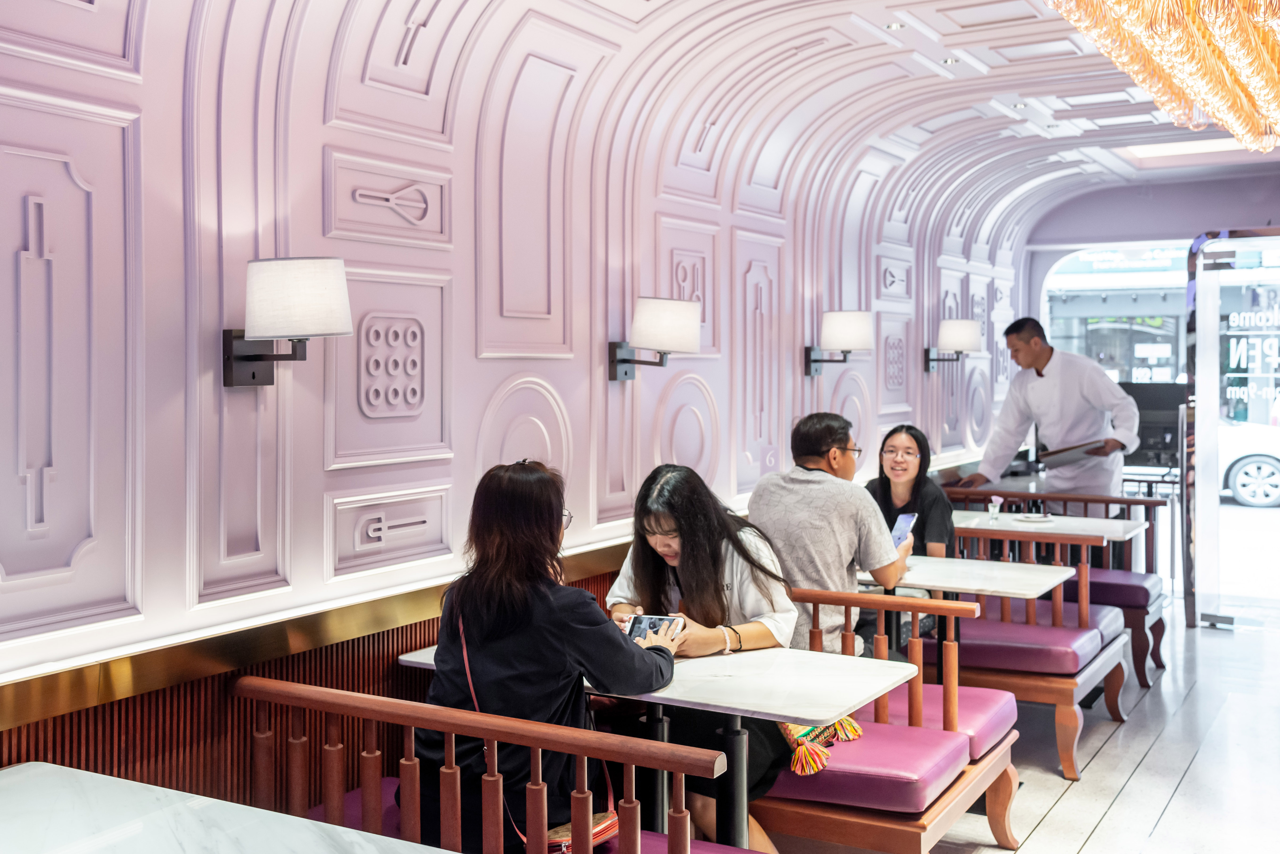 ใครที่ผ่านไปผ่านมาในย่านสยามสแควร์ ซอย 3 คงเคยสังเกตเห็นประตูสีชมพูหวานสะดุดตาของร้าน Sweet Chef Cafe กันบ้าง ซึ่งคอนเซ็ปต์ของทางร้านจะอ้างอิงสไตล์การตกแต่งมาจากรายการทีวี ที่เลือกใช้สีลาเวนเดอร์ และแอบซ่อนดีเทลต่าง ๆ ไว้ในทุก ๆ มุมของร้าน อย่างมุมกำแพงโค้งที่มีการออกแบบลวดลายผนังให้เป็นรูปสลักอุปกรณ์เครื่องครัว