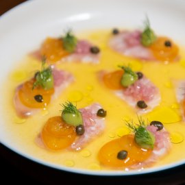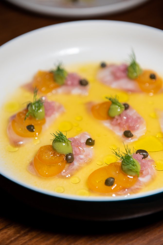 หรือจะลองเป็นจานสดชื่นอย่าง Fish Crudo (590 บาท) เมนูเรียกน้ำย่อยสุดสดชื่นที่หยิบเอา ปลาคอบิย่าจากไทย ปลาทะเลเนื้อขาวเนียนที่โดดเด่นด้วยรสสัมผัสนุ่มละมุน มารังสรรค์ในแบบ Crudo หรือสไตล์ปลาดิบแบบอิตาเลียน ราดด้วย ซิตรัสเดรสซิ่ง ช่วยเพิ่มความเปรี้ยวสดชื่น เสริมรสหวานอมเปรี้ยวด้วย Kumquat ผลไม้รสเปรี้ยวที่ตัดรสได้อย่างลงตัว เคียงด้วย อโวคาโดมูสเนื้อเนียน, เคเปอร์, ผักดอง และ น้ำมันมะกอก เพื่อเพิ่มความกลมกล่อมในทุกคำ