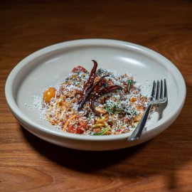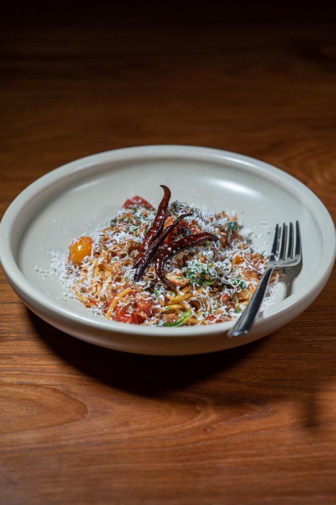 ต่อกันด้วย Crab Pasta (490 บาท) เมนูพาสต้าสุดเข้มข้นที่สายซีฟู้ดไม่ควรพลาด! เชฟเลือกใช้เส้นพาสต้าแบบ Chitarra ที่ขึ้นชื่อเรื่องเส้นหนึบ เด้ง ทำสดใหม่จากทางร้าน คลุกเคล้ากับซอสสูตรพิเศษสไตล์ Tabula ที่ได้รับแรงบันดาลใจจาก ซอส XO ในสูตรเฉพาะของเชฟ เพิ่มความหอมกลมกล่อมด้วย มะเขือเทศย่าง ที่ให้รสหวานอ่อน ๆ ตัดรสเข้ม และเติมความเค็มมันด้วย พาร์เมซานชีส โรยหน้า ไฮไลต์อยู่ที่เนื้อปูสด เนื้อหวานแน่น ที่คลุกเคล้าอยู่ทั่วจาน ได้ทั้งความหอม รสชาติเข้มข้น และความสดใหม่ในคำเดียว