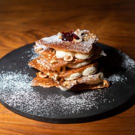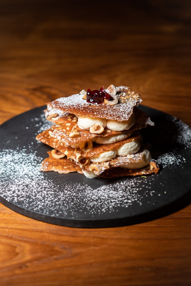ปิดท้ายด้วย Mille Feuille (290 บาท) ของหวานสุดคลาสสิกอย่าง ที่พิเศษด้วยรสสัมผัสและวัตถุดิบพรีเมียม ชั้นแป้งกรอบบางสลับชั้นอย่างพิถีพิถัน เชฟใช้ เฮเซลนัตแครกเกอร์ เพิ่มความหอมมันและความกรุบกรอบให้แตกต่างจากมิลเฟยทั่วไป สอดไส้ด้วย พาสทรีครีมเนื้อเนียน หอมกลิ่นวนิลลาในทุกคำตัดรสด้วย Amarena cherry เชอร์รี่ดำจากอิตาลีที่ให้รสเปรี้ยวหวานลุ่มลึก เพิ่มความหรูหราด้วย ไอซิ่งชูการ์ โรยบาง ๆ ด้านบน หวานนุ่ม กลมกล่อม