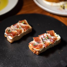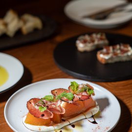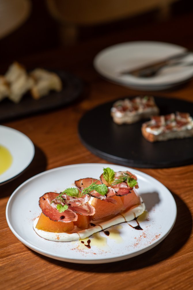 เริ่มต้นกันที่จานแรกอย่าง Melon and Coppa (290 บาท) เมนูเรียกน้ำย่อยที่เรียบง่ายแต่รสชาติซับซ้อนโดยเชฟเชฟเอา เมลอนดองที่ผ่านกรรมวิธีแบบ Compressed Pickle จนได้เนื้อสัมผัสที่แน่นหนึบ ช่วยดึงรสชาติหวานฉ่ำ เสิร์ฟมาบนครีมชีสมาสคาโปน เนื้อเนียนนุ่ม ท็อปด้วย Coppa เนื้อหมูจากอิตาลีที่ทำจากส่วนคอและบ่า ราดด้วย Balsamic Glazed