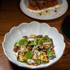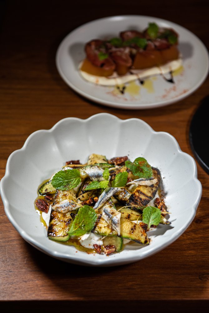 ต่อกันด้วย Grilled Zucchini Anchovy (380 บาท) ที่เชฟใช้ซูกินีหมัก ก่อนจะนำไปย่าง เสริมความกลมกล่อมด้วย แองโชวี มาพร้อมกับ Stracciatella ชีสสดเนื้อนุ่ม ก่อนจะเสริมความกรุบกรอบและรสหวานจาก Pecan Candied เคลือบด้วยน้ำตาล ได้รสชาติหวานตัดเค็มอย่างลงตัว ก่อนจะปิดท้ายด้วย เปลือกมะนาวดองและใบมินต์ที่ช่วยเพิ่มรสเปรี้ยวและความสดชื่น ให้ความหลากหลายและซับซ้อนของรสชาติและเนื้อสัมผัสที่น่าสนใจ