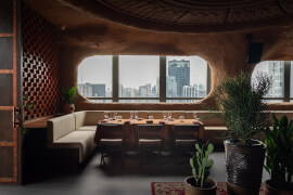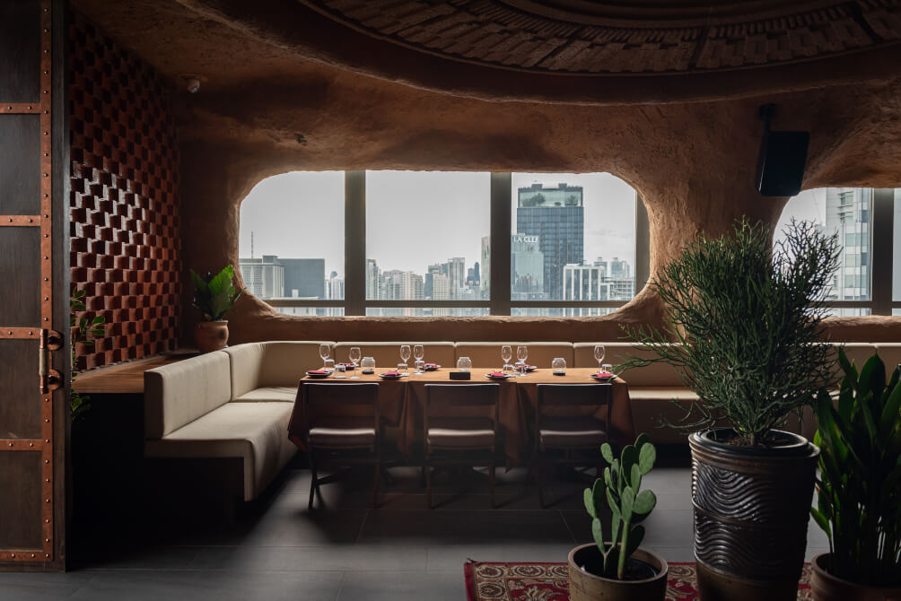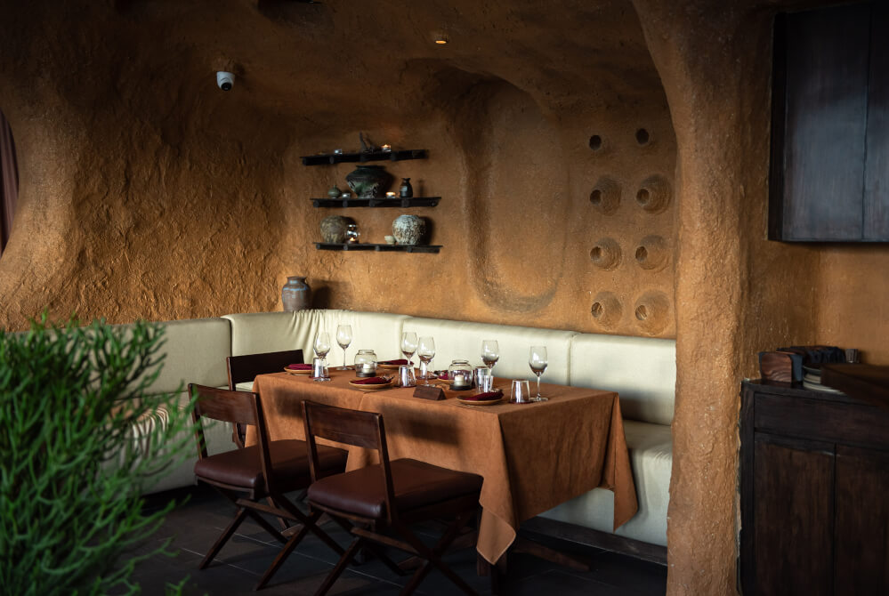 ตัวร้านให้ความลึกลับน่าค้นหาในแบบ Santuary ที่ได้แรงบันดาลใจจาก Toron Architecture ผสานเข้ากับภูมิปัญญาท้องถิ่นอย่างกลมกลืน โดยเน้นการออกแบบที่ใช้ผนังอิฐดินโทนสีและพื้นผิวธรรมชาติให้ความรู้สึกที่เรียบง่ายแต่ทรงพลัง ราวกับเดินย้อนเวลากลับไปสู่ยุคดั้งเดิม ท่ามกลางบรรยากาศที่คงไว้ซึ่งความสงบ โอบล้อมด้วยทัศนียภาพสวย ๆ ใจกลางกรุงเทพมหานครฯ