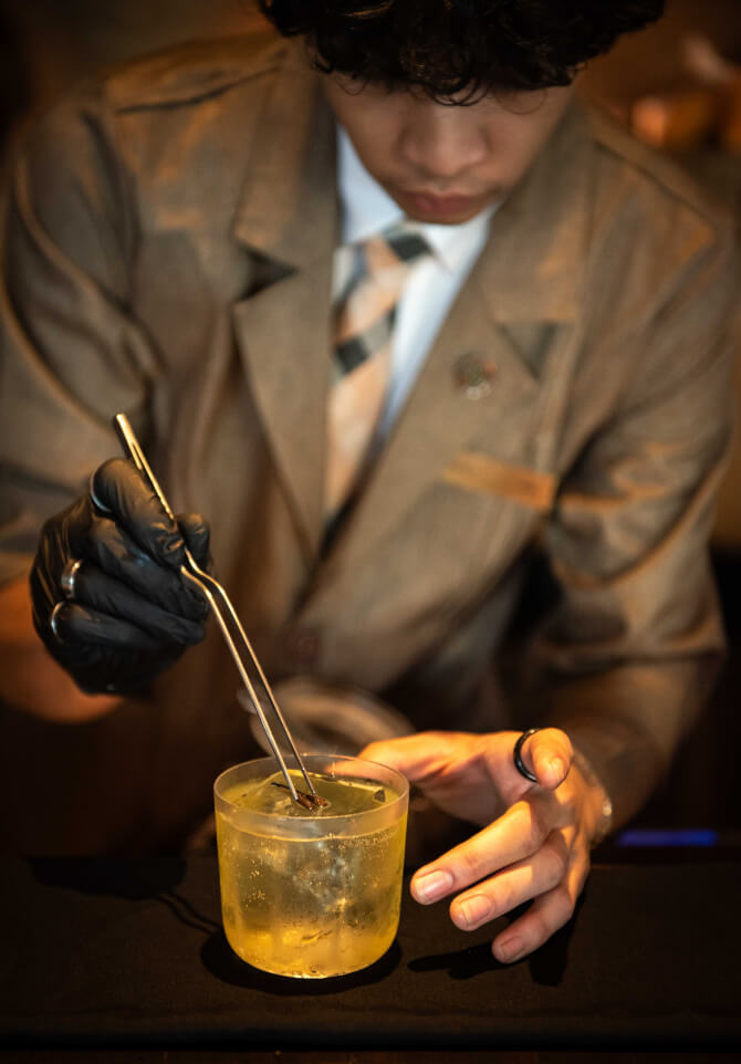 สามารถจับคู่กันกับเครื่องดื่มน่าลองอย่าง El Caballo (480 บาท) ค็อกเทลแนว Spirit-forward ที่ใช้เห็ดเยื่อไผ่ผสมควบกับ Porcini หยดบนก้อนน้ำแข็งปั้มรอยกีบม้า ถ่ายทอดรสชาติที่เชื่อมโยงกับรากชื่อของ Tahona อย่างลึกซึ้ง