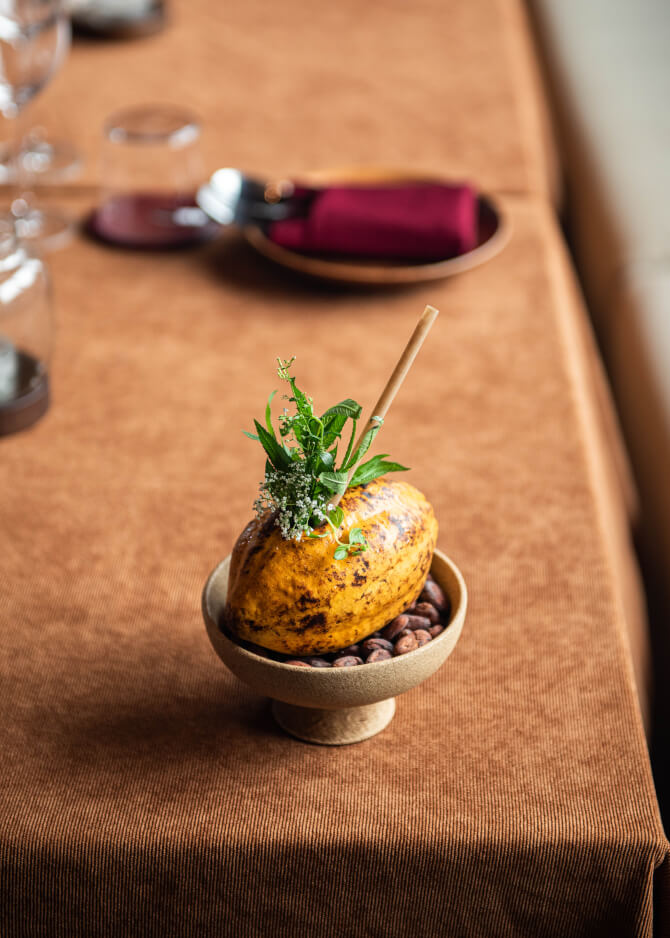 แน่นอนว่าพลาดไม่ได้กับค็อกเทลน่าลองหลากหลายตัวอย่าง Flor De Cacao (440 บาท) เครื่องดื่มค็อกเทลผสานความเข้มของโกโก้กับกลิ่นหอมละมุนจากดอกไม้สด ถ่ายทอดความร่วมสมัยอย่างงดงามตามชื่อของเมนู ให้รสสัมผัสที่ทั้งนุ่มนวลและมีเสน่ห์