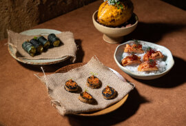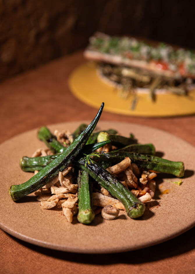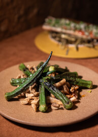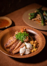 หรือจะลองเป็น Okar with Makhaen (220 บาท) เมนูที่ซ่อนความเข้มข้นและเสน่ห์เฉพาะตัวของน้ำพริกเผาโฮมเมดไว้อย่างประณีต ผสานส่วนผสมของกุ้งและกลิ่นหอมจากพริกคั่ว รสชาติหวานน้อยแต่จัดจ้านอย่างลงตัว ก่อนจะปิดท้ายด้วยกากหมูกรุบกรอบและกระเจี๊ยบราชบุรีที่เติมมิติทั้งรสและสัมผัสให้ทุกคำเต็มไปด้วยความทรงจำ