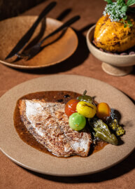 Roasted Local Fish with Fermented Black Bean Sauce (850 บาท) เชฟนำปลาตาเดียวคัดพิเศษย่างจนหนังกรอบ ราดด้วยซอสถั่วดำหมักและซอสเต้าซี่รสกลมกล่อม ตัดด้วยความเปรี้ยวสดชื่นจากส้มจี๊ดโคโช และตกแต่งด้วยมะเขือเทศสามสีและพริกชิชิโกะ เติมเต็มรสชาติและสีสันอย่างลงตัว