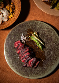 Wagyu Hanger & Local Black Pepper Sauce (960 บาท) เมนูนี้เชฟใช้เนื้อวากิวพรีเมียมที่ผ่านการปรุงจนได้ระดับสุกที่พอดี เนื้อนุ่มละลายในปาก มาพร้อมกลิ่นหอมจากต้นหอมย่างและน้ำมันสมุนไพร เสิร์ฟคู่ซอสพริกไทยดำสูตรเฉพาะ เพิ่มเสน่ห์ให้ทุกคำลิ้มรส