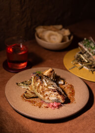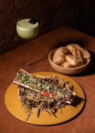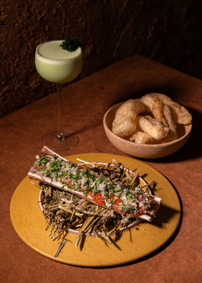 ต่อกันด้วย Bone Morrow Pate (440 บาท) เมนูที่สะท้อนกลิ่นอายความเป็นไทยแท้ เชฟเลือกใช้ แคบควาย ที่ให้รสสัมผัสกรุบกรอบเป็นพิเศษ ก่อนนำไปปรุงกับสมุนไพรพื้นบ้านอย่างประณีต ทั้งผักชี ต้นหอม กระเทียม และหอมแดง เพื่อเติมเต็มกลิ่นหอมอบอวลและรสชาติที่ลึกซึ้งในทุกคำ สามารถทานคู่กับเครื่องดื่มน่าลองอย่าง Guava Batida (420 บาท) เมนูที่จะตีความใหม่ของ Batida แบบบราซิล ด้วยกลิ่นหอมของฝรั่ง ใบดาวเรือง โยเกิร์ต และใบโหระพาสด เติมรสชาติสดชื่น นุ่มละมุน ดื่มง่าย เหมาะสำหรับค่ำคืนที่ต้องการผ่อนคลาย