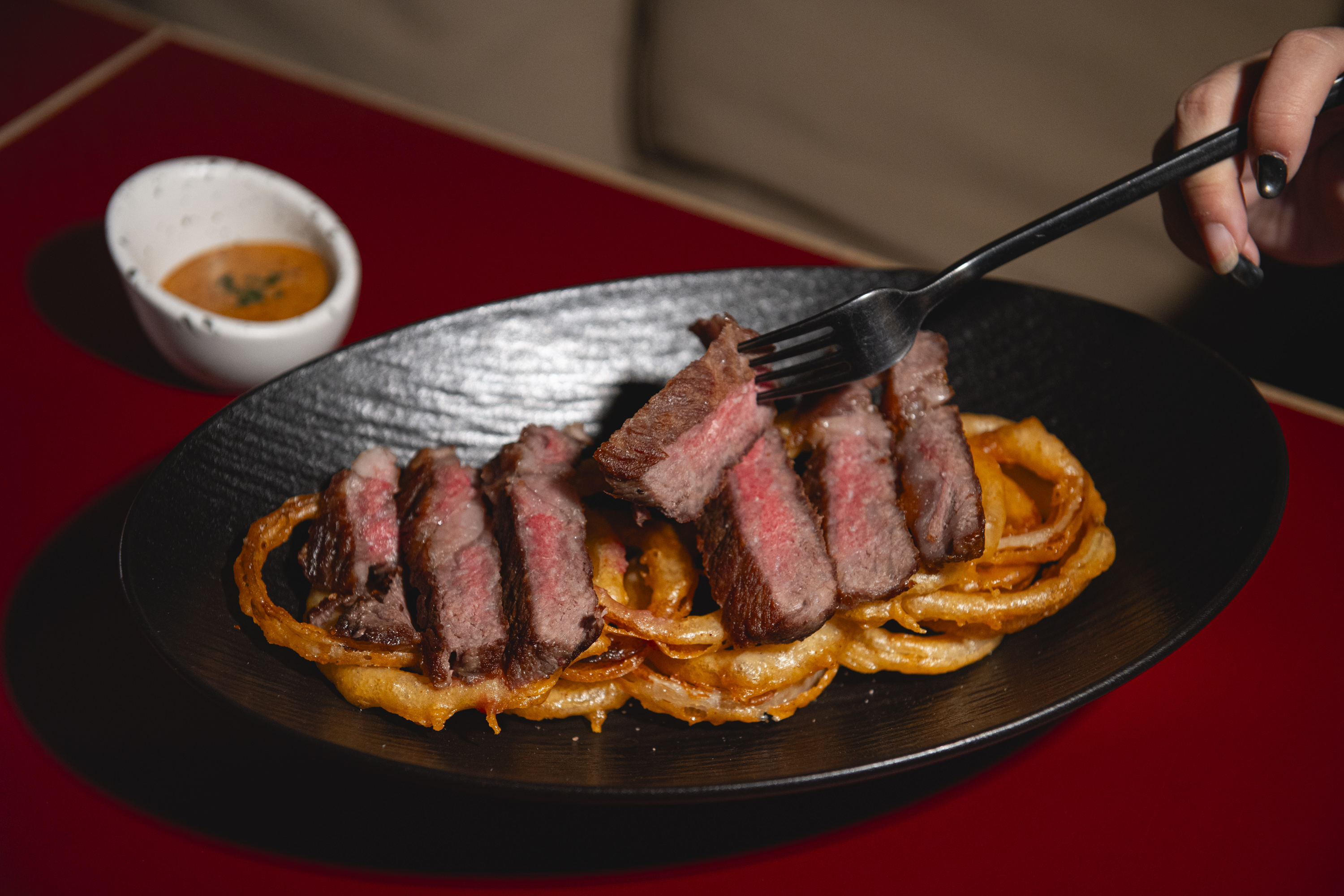 Surin Thai-Wagyu Striploin Steak with Onion Rings (888 บาท)
