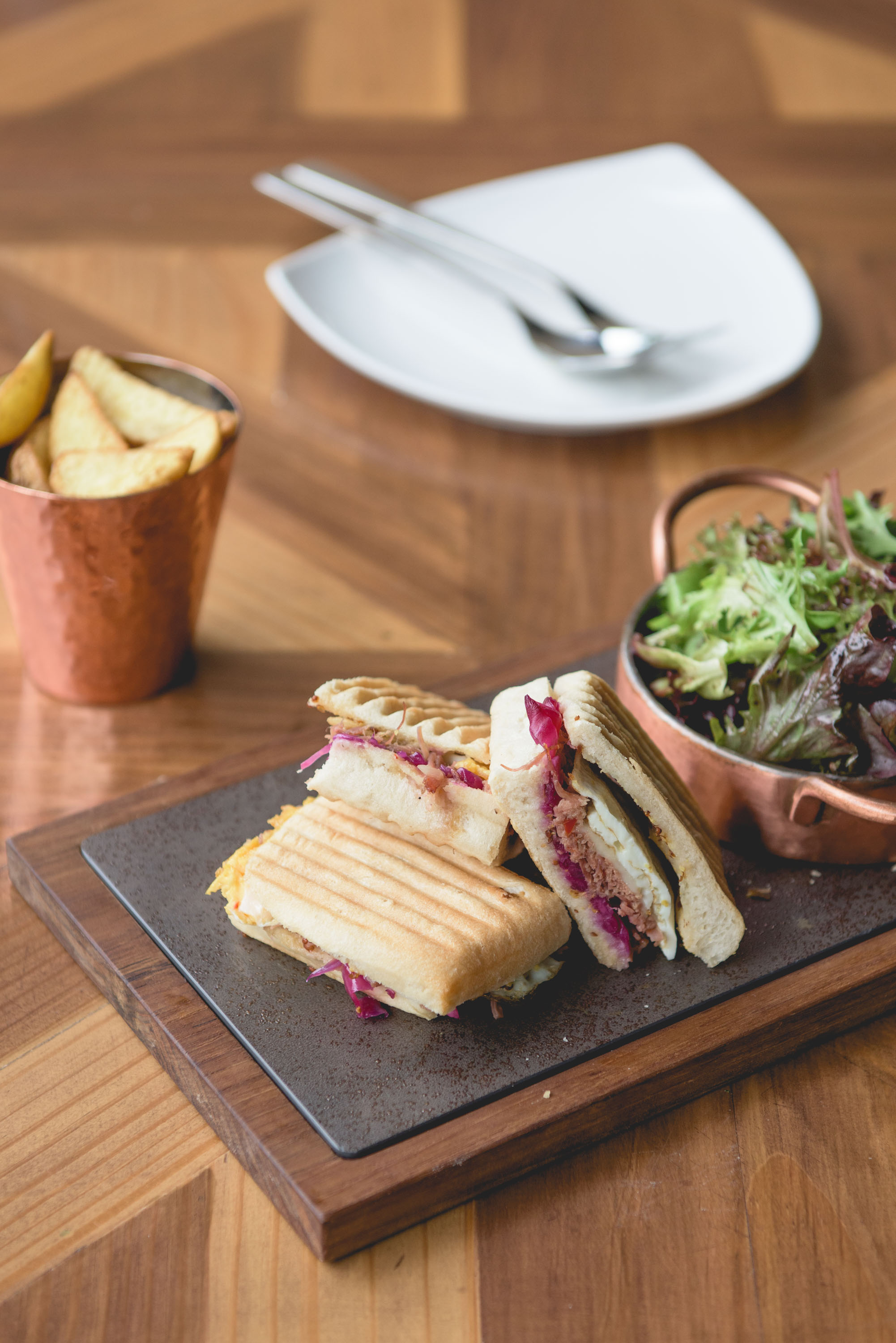 ถัดมาเป็น Toast Panini Corn Beef & Egg (320 บาท) ขนมปังย่างร้อน ๆ ทาเกรนมัสตาร์ด ใส่ไส้คอร์นบีฟ กะหล่ำม่วงดอง ไข่ดาว และกรูแยร์ชีส มาพร้อมสลัดและมันฝรั่งทอด
