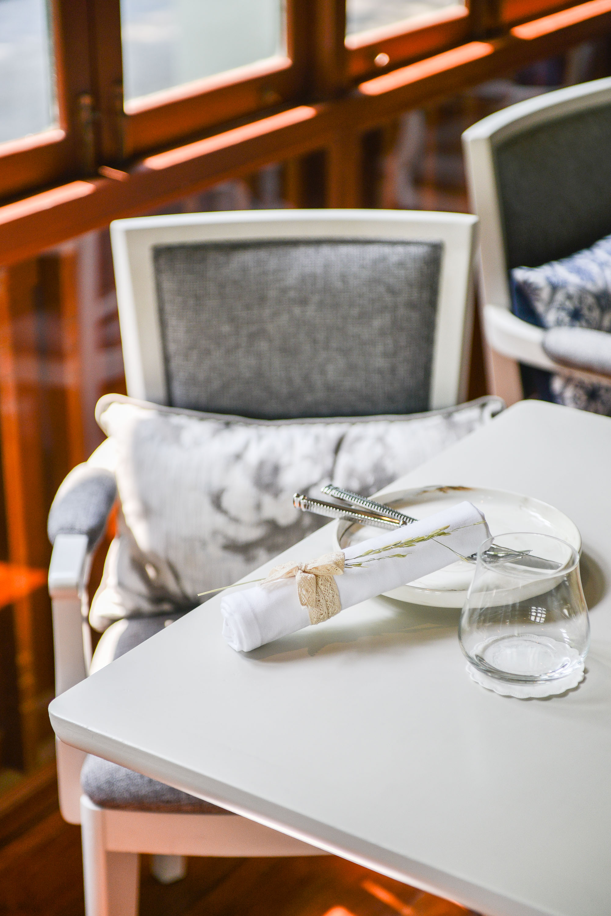 ด้วยความที่ห้องอาหารตั้งอยู่ภายในรีสอร์ทสไตล์โคโลเนียล ดังนั้นตัวอาคารด้านนอกและบรรยากาศภายในห้องอาหารจึงถูกตกแต่งให้สอดคล้องกัน ตกแต่งในโทนสีขาวเขียว ตัวร้านถูกล้อมรอบด้วยกระจกใส ทำให้มองเห็นความร่มรื่นของแมกไม้เขียวขจีบริเวณด้านนอกห้องอาหาร โดยสำหรับใครที่อยากเปลี่ยนบรรยากาศ สามารถออกไปทานอาหารพร้อม ๆ กับชมสวนสวย ๆ ได้เช่นกัน
