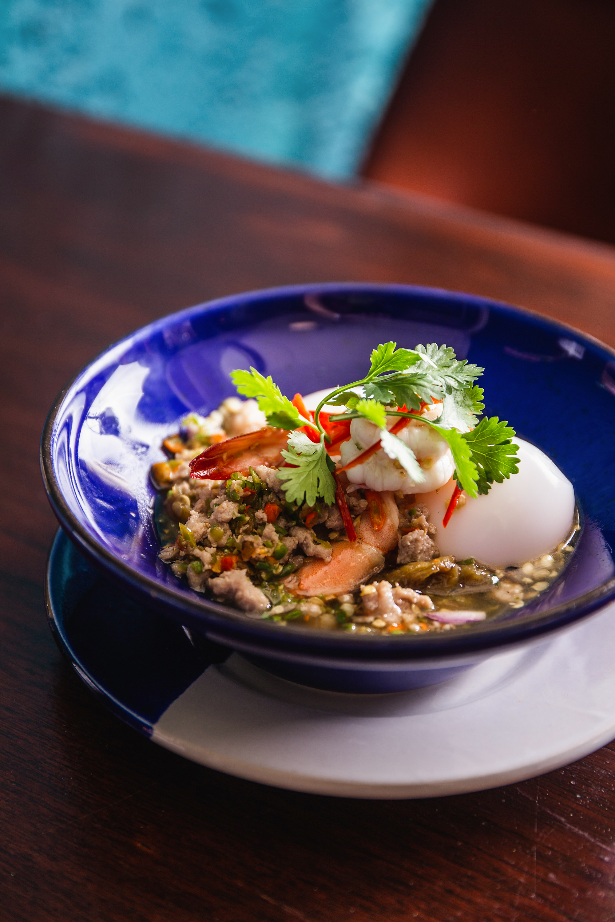 ต่อด้วยอีกหนึ่งเมนูไฮไลต์จานอร่อยอย่าง พริกยำไข่ยางมะตูม (80บาท) เป็นไข่ต้มยางมะตูมที่ราดมาด้วยพริกยำสูตรเด็ดที่ทำมาจากน้ำพริกหนุ่มเผา ใส่หมูสับ กุ้งลวก ปรุงเข้ากันเป็นรสกลมกล่อมถูกปากจนต้องสั่งมาลองกันทุกโต๊ะ