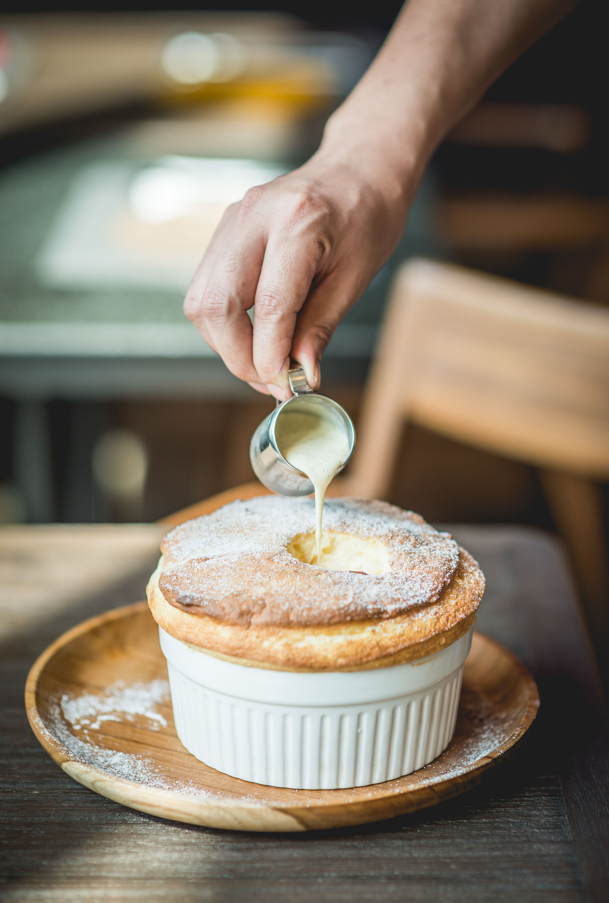 สำหรับของหวาน ทางร้านแนะนำ แครมบรูเล่กล้วย (190 บาท) ด้านล่างเป็นคัสตาร์ดเนื้อนุ่ม ๆ ท็อปด้วยกล้วยและคาราเมล เวลาเสิร์ฟจะจุดไฟเผาผิวหน้าเพื่อให้หอมกลิ่นไหม้จาง ๆ