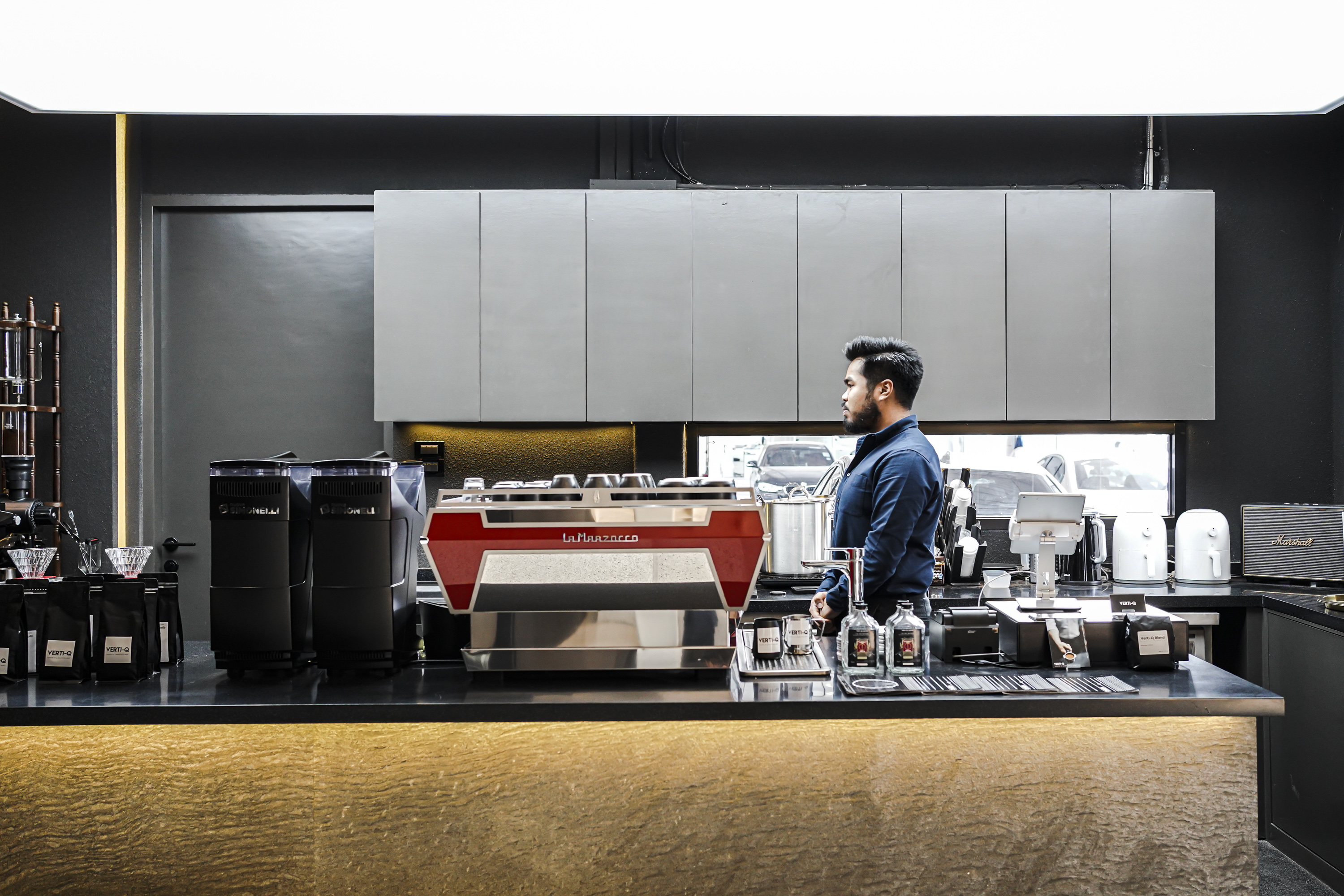 เคาน์เตอร์บาร์โดดเด่นด้วยเครื่องชงกาแฟ LaMarzocco ท่ามกลางบรรยากาศเรียบง่ายสไตล์ดิบเท่