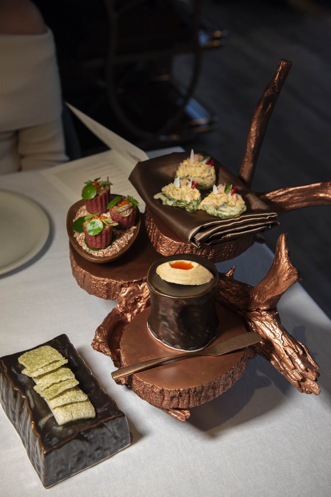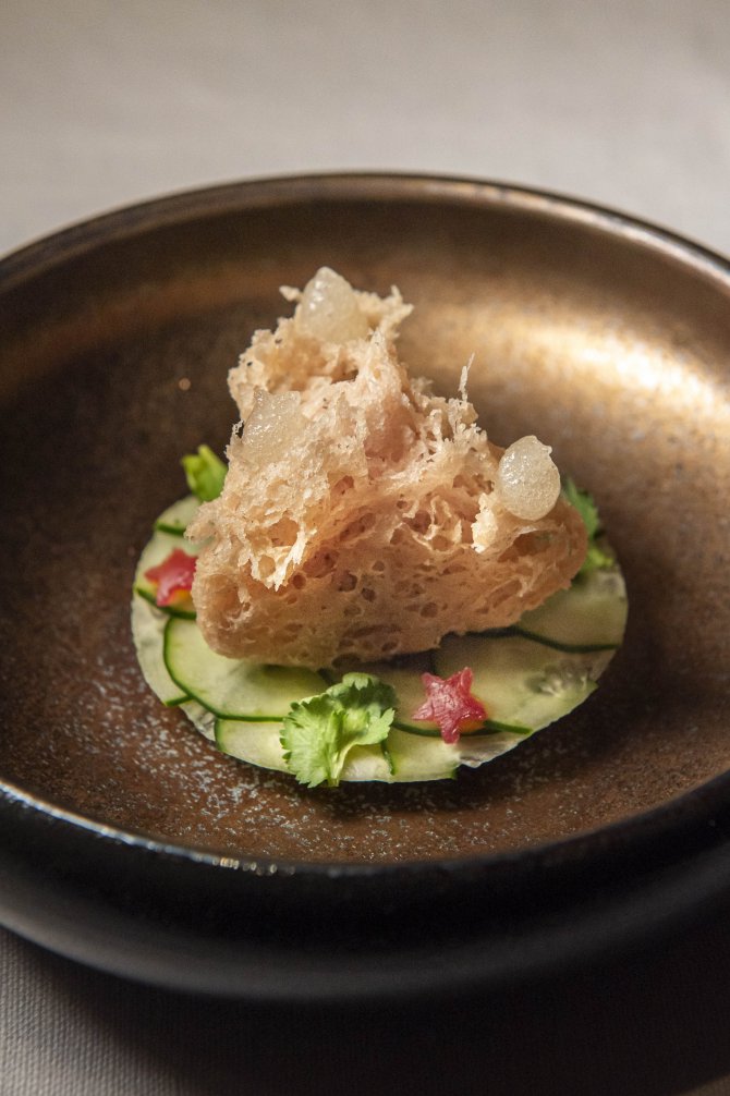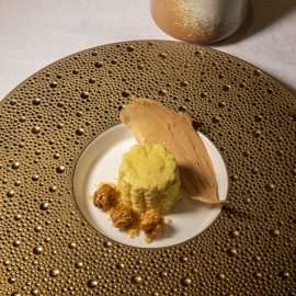 สำหรับคอร์สของที่นี่ เชฟภูมินำเสนอ Tasting Menu (3,850 บาท) เริ่มต้นแล้วค่อย ๆ พาไปสู่ความเข้มข้น โดยเปิดด้วย Amuse-Bouche 3 คำ ที่หยิบเมนูไทยคลาสสิกมาตีความใหม่ ประกอบไปด้วย ข้าวตังหน้าตั้ง ที่เสิร์ฟแผ่นข้าวตังบางกรอบมาพร้อมกับมูสหน้าตั้งทานง่าย ต่อด้วย ข้าวสังข์หยดน้ำพริกลงเรือ เสิร์ฟเป็นคำทานง่าย ก่อนจะปิดท้ายด้วยความแซ่บซ่าของ ยำผิวส้มซ่า
