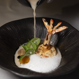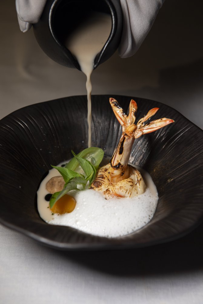 อีกหนึ่งจานน่าสนใจคือ ยำส้มโอ ที่เชฟเลือกเพิ่มเลเยอร์ด้วยไข่ปลาหมึกแดดเดียวและซีฟู้ดทอดกรอบ ให้ทั้งความสดชื่นและเท็กซ์เจอร์ในคำเดียว ต่อกันด้วย ซุปแกงเลียงกุ้ง ที่ถูกปรับให้ร่วมสมัยขึ้นด้วยการท็อปโฟมแมงลักที่ช่วยยกระดับกลิ่นหอม ทานคู่กันกับกุ้งตัวใหญ่เนื้อนุ่ม