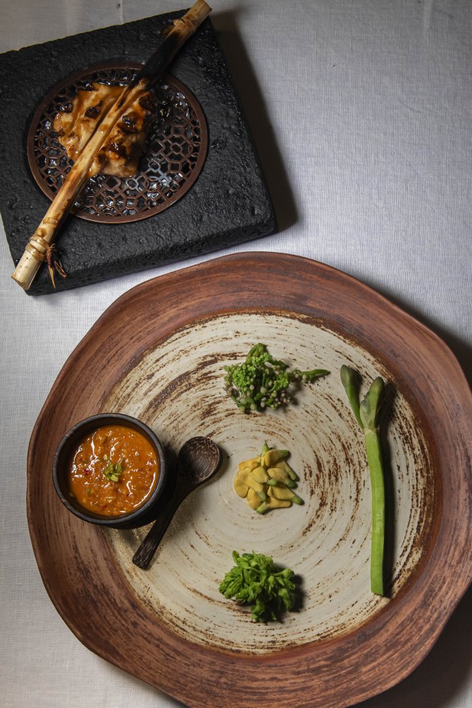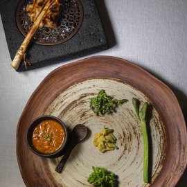 จากนั้นคั่นความอร่อยด้วย ไก่กะทิน้ำพริกก้อยกุ้ง ที่โดดเด่นด้วยเทคนิคการฉีดกะทิเข้าเนื้อไก่ก่อนนำไปย่าง ทำให้ได้เนื้อสัมผัสฉ่ำและกลิ่นหอมชัด เชฟเสิร์ฟพร้อมกันกับน้ำพริกก้อยกุ้งรสแซ่บแบบไทย ๆ และผักเคียง