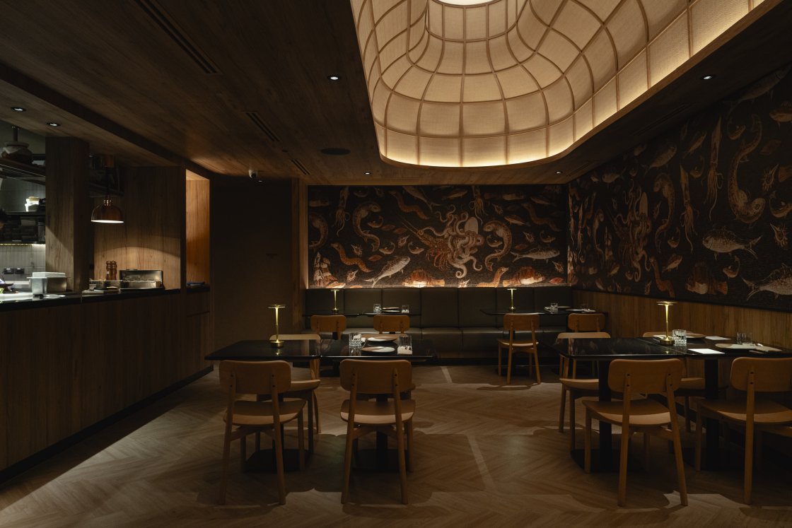 ภายในเน้นการตกแต่งในสไตล์โมเดิร์นและใช้สีดำเป็นหลัก ทำให้บรรยากาศดูสงบและหรูหรา ให้บริการทั้งโซนห้องส่วนตัวสำหรับกลุ่มที่มาเป็นหมู่คระ หรือใครอยากนั่งชิลล์ ๆ ที่เคาน์เตอร์บาร์ก็เอ็นจอยไม่แพ้กัน นอกจากนี้ยังมีโต๊ะรองรับสำหรับ 4 - 6 ท่าน ติดบานผนังกระจกเปิดโล่งให้คุณได้เห็นวิวสวนเล็ก ๆ ของโครงการ ช่วยให้มื้อนี้ของคุณเพลิดเพลินยิ่งขึ้น