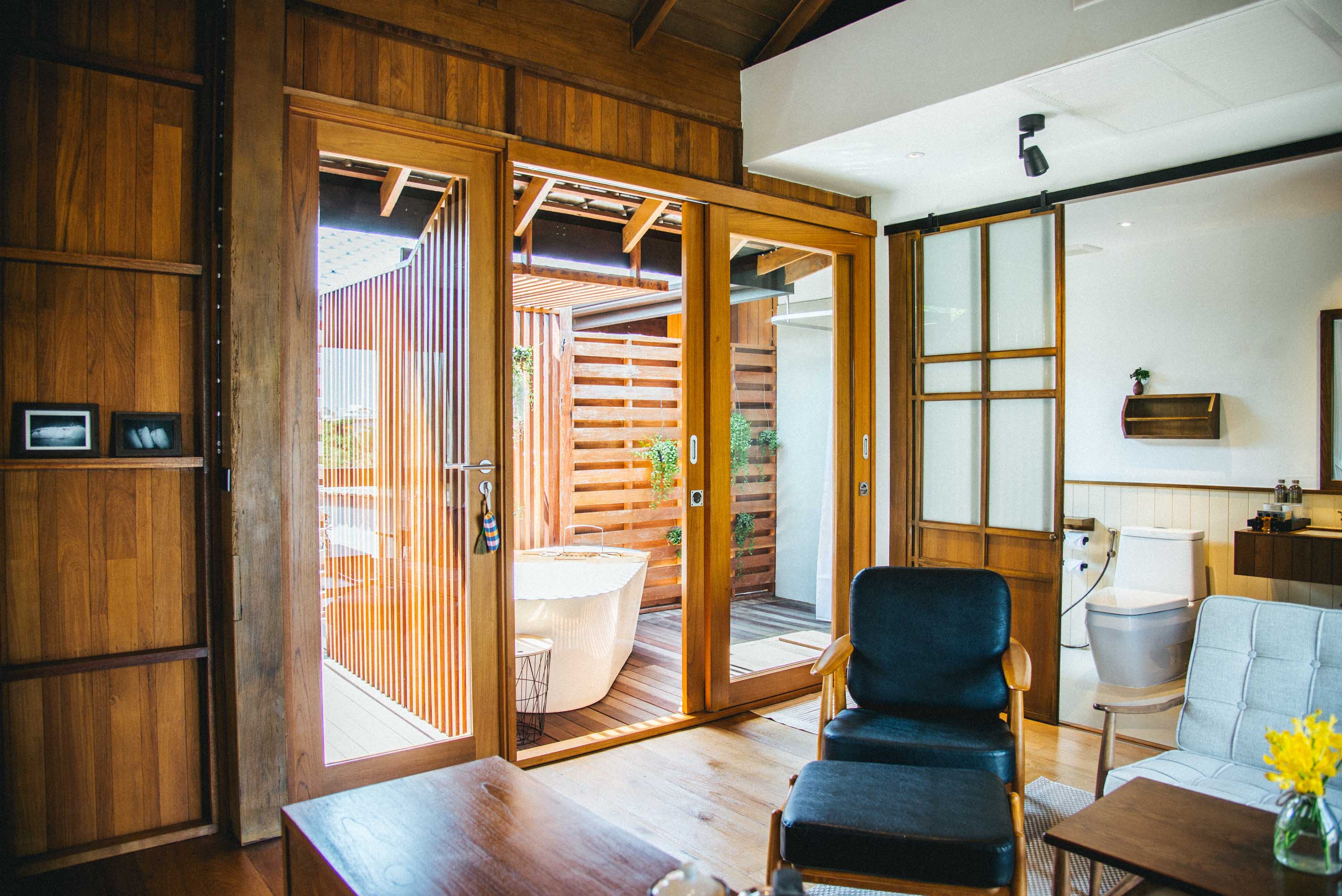 ภายในห้องพักมีการเลือกใช้เฟอร์นิเจอร์และของตกแต่งที่ให้ความอบอุ่น สบายตา อย่างโทนสีขาว ฟ้า ซึ่งสอดรับกับธรรมชาติ เล่นแสงเงา และสีของเนื้อไม้ได้พอดิบพอดี พร้อมสร้างบรรยากาศการเข้าพักให้อินมากขึ้นไปอีก ด้วยกิมมิกของการนำภาพถ่ายขาวดำ ภาพวิถีชีวิตโดยรอบริมคลองบางกอกน้อยที่บอกเล่าเรื่องราวของที่นี่มาร่วมตกแต่งด้วย