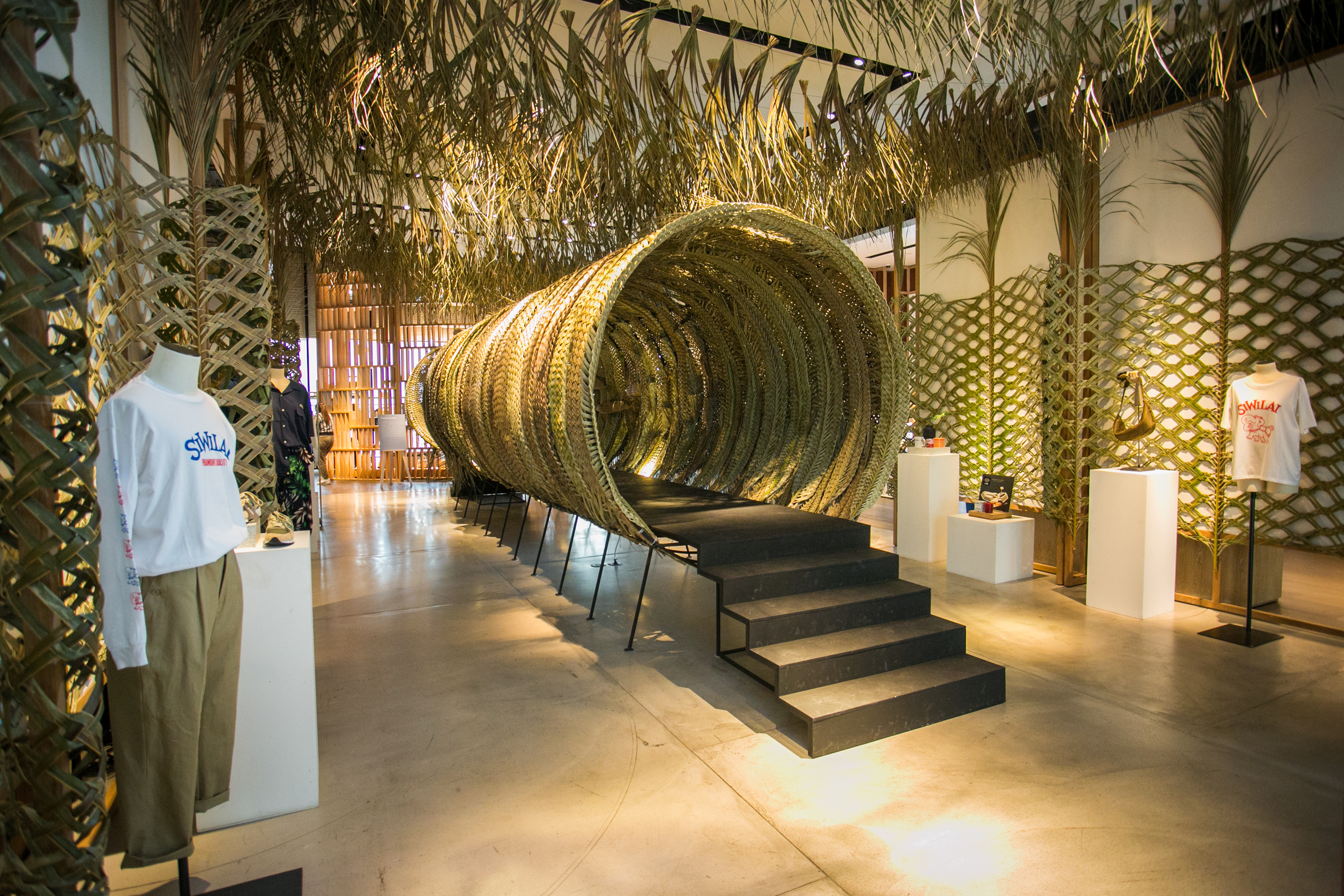 บรรยากาศภายในโซน The Flow of River การเลือกใช้วัสดุธรรมชาติอย่างใบจากและทางมะพร้าวที่ปลูกริมแหล่งน้ำ (Photo by SIWILAI)