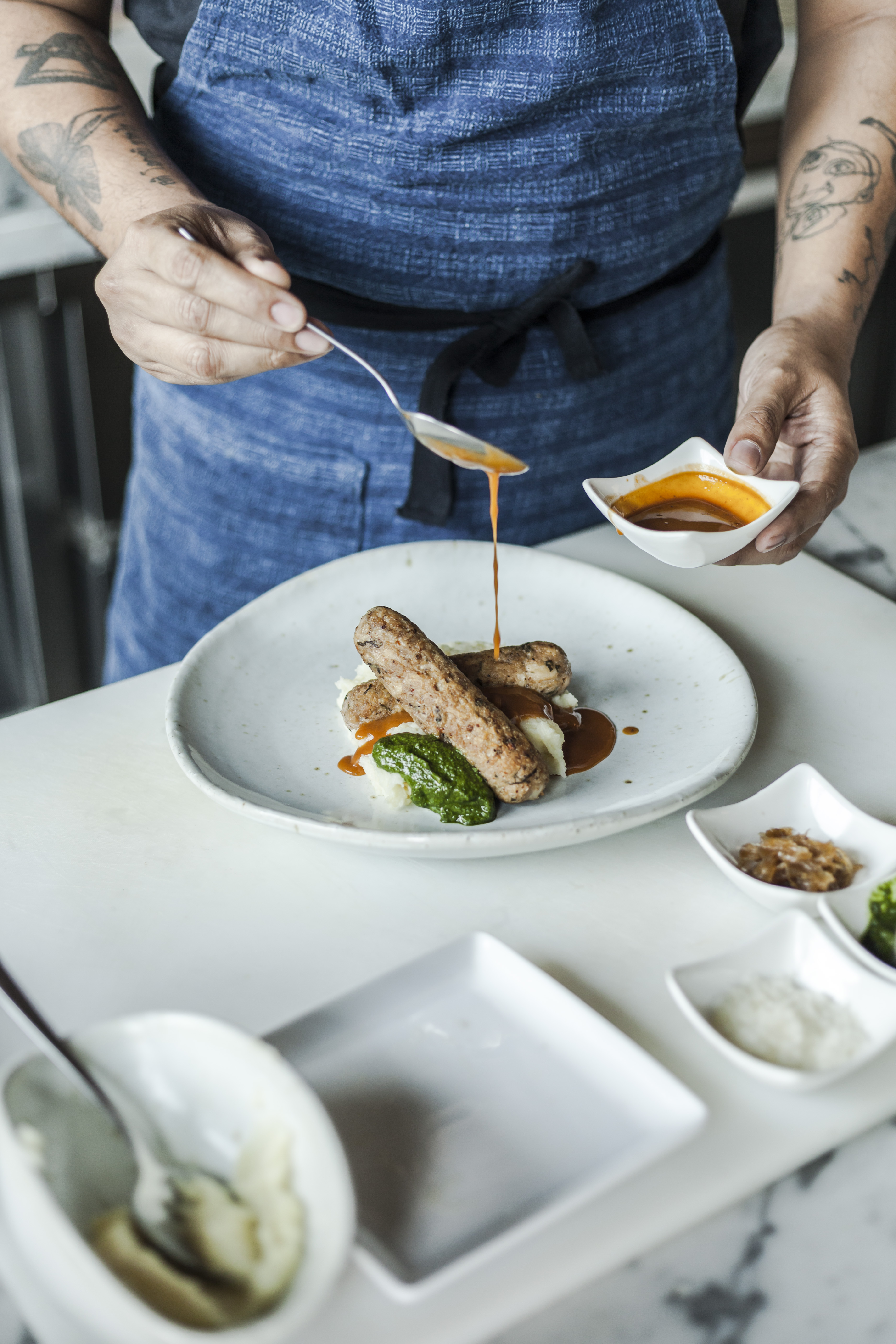 Northern Chicken Larb Sausages with Chicken and Pineapple Gravy, Mashed Potatoes Pennywort Pesto ไส้กรอกไก่รสลาบเหนือย่าง ราดเกรวี่โครงไก่และกากสับปะรด มันบดและใบบัวบกเพสโต้ ให้รสเผ็ดร้อนของไส้กรอกที่เข้ากับความหวานมันของกากสับปะรดและมันบด ซึ่งมาตัดรสชาติกันได้อย่างพอดิบพอดี