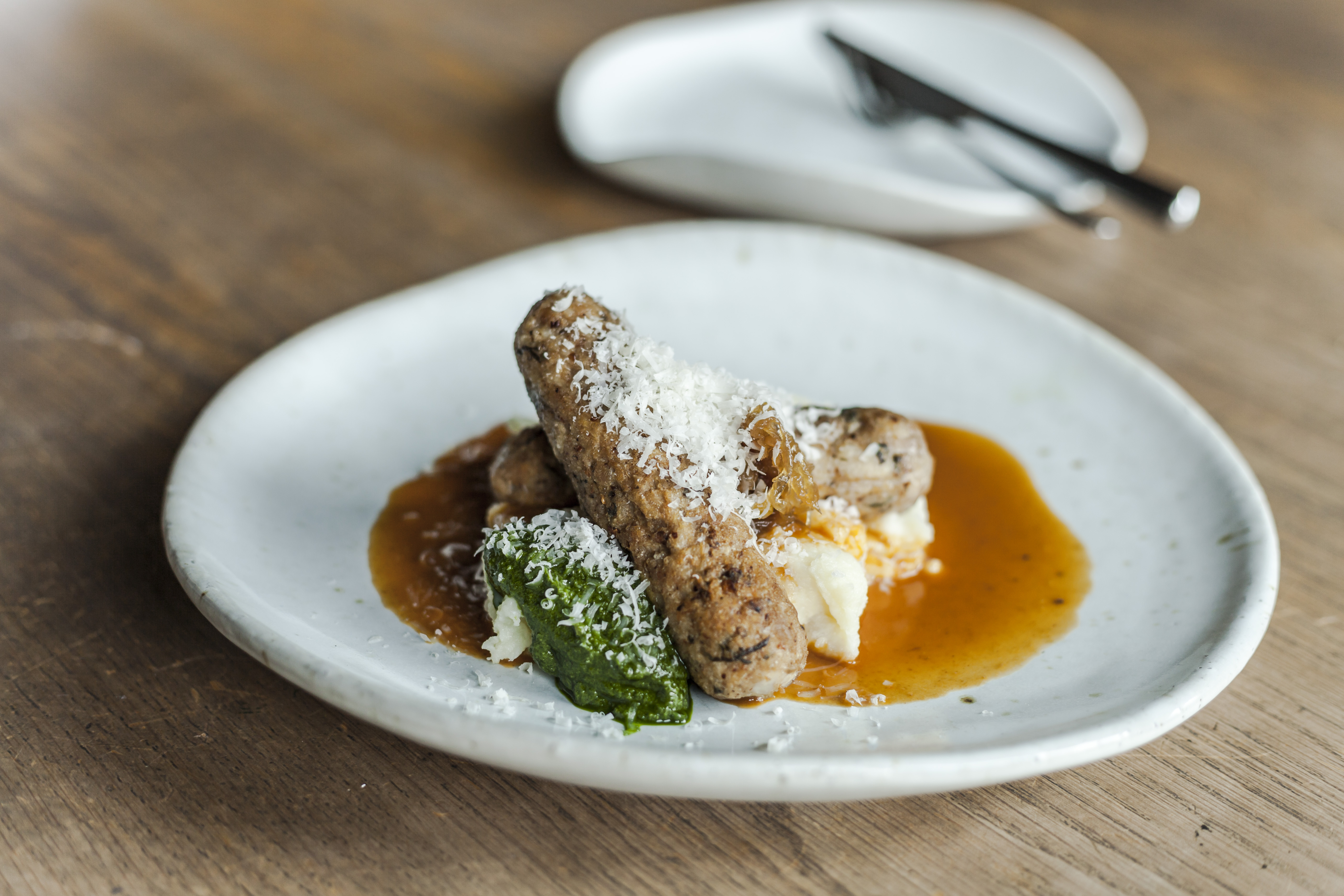 Northern Chicken Larb Sausages with Chicken and Pineapple Gravy, Mashed Potatoes Pennywort Pesto