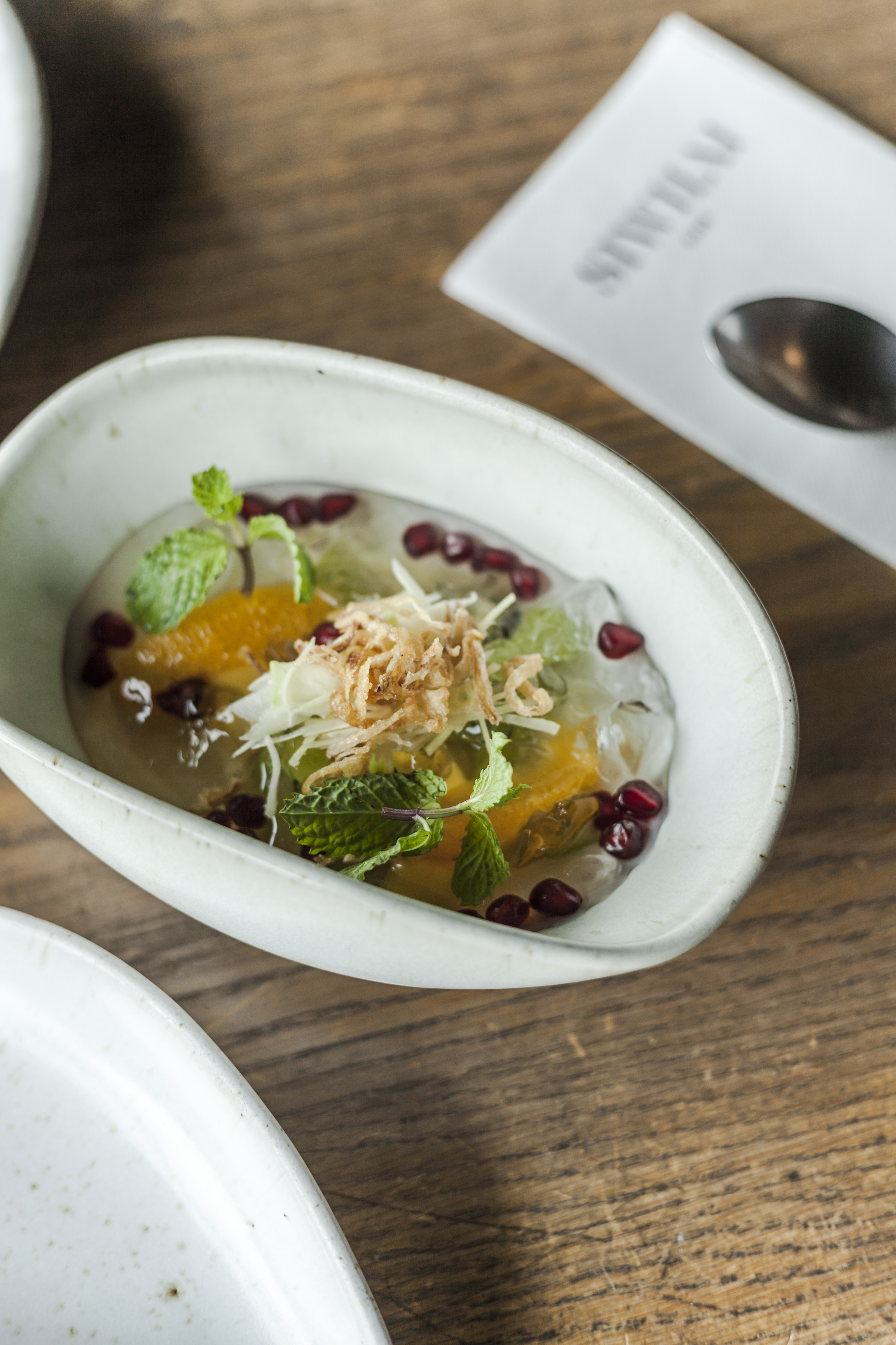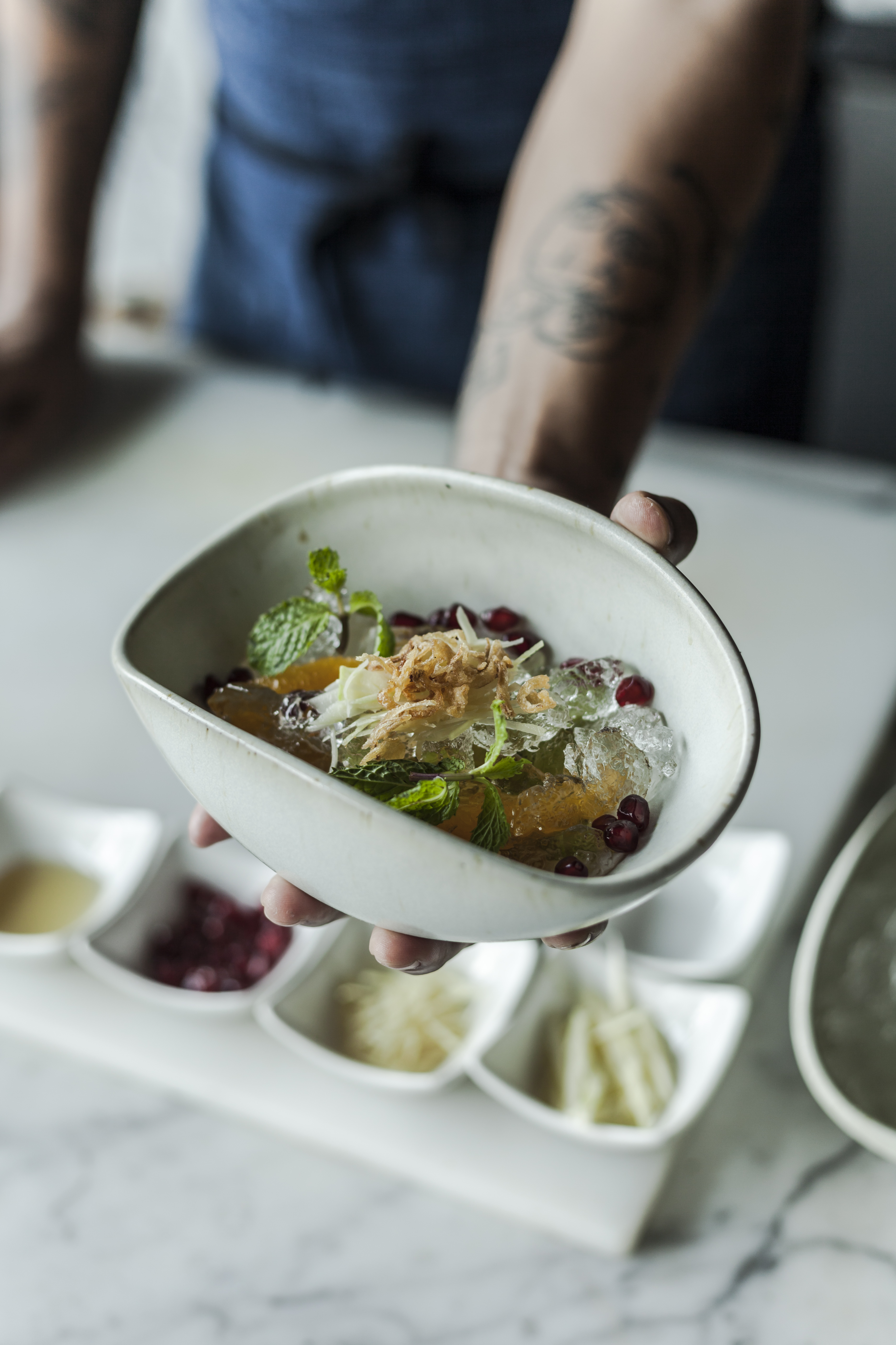 Pickling Fruit in Torch Ginger Flower Syrup Kefir Lime Rind Compote, Som-Sa, Pickled Green Mango, Ginger, Crispy Shallot and Seasonal Fresh Fruit ส้มฉุนผิวมะกรูดเชื่อม ผสมน้ำเชื่อมเกสรดาหลากับส้มซ่า มะม่วงเบาแช่อิ่ม ขิงซอย และผลไม้ตามฤดูกาล แล้วปิดท้ายด้วยน้ำแข็งไสป่นให้ได้ทานแบบเย็น ๆ เป็นการผสมผสานความหอมและรสชาติหวานอมเปรี้ยวของผลไม้ สมุนไพรนานาชนิดในชามเดียว ทานแล้วชื่นใจ