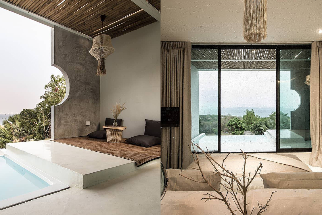 ตกแต่งในสไตล์มินิมัล เน้นใช้สีขาวครีมดูสะอาดตาและปูนเปลือย แฝงมู้ดสไตล์รีสอร์ทบาหลีด้วยของตกแต่งที่ทำจากหวายและระแนงไม้ไผ่ นอกจากนี้ ยังมีโซนร้านอาหารและบาร์ที่รายล้อมด้วยวิวพาโนรามาของทะเล ไว้ต้อนรับใครที่ได้มานั่งทานอาหารและจิบค็อกเทลกันแบบสบาย ๆ อีกด้วย รับรองว่าใครที่ได้มาพักที่นี่จะได้ภาพสวย ๆ กลับไปแน่นอน