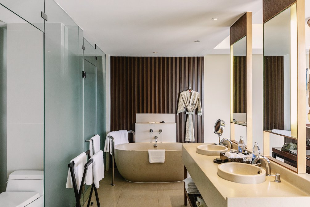 สเปซห้องกว้างขวาง กั้นด้วยกระจกใสโชว์อ่างอาบน้ำขนาดใหญ่ให้คุณได้พักผ่อนนอนแช่น้ำ พร้อมระเบียงชมวิวทุกห้อง ที่มองออกไปเห็นผืนหญ้าสีเขียวสบายตา มีระเบียงใหญ่ตัดกับท้องฟ้าริมทะเล ภายใต้บรรยากาศเงียบสงบ ให้คุณได้ใช้เวลาพักผ่อนไปกับบรรยากาศตรงหน้าอย่างเต็มอิ่มที่สุด