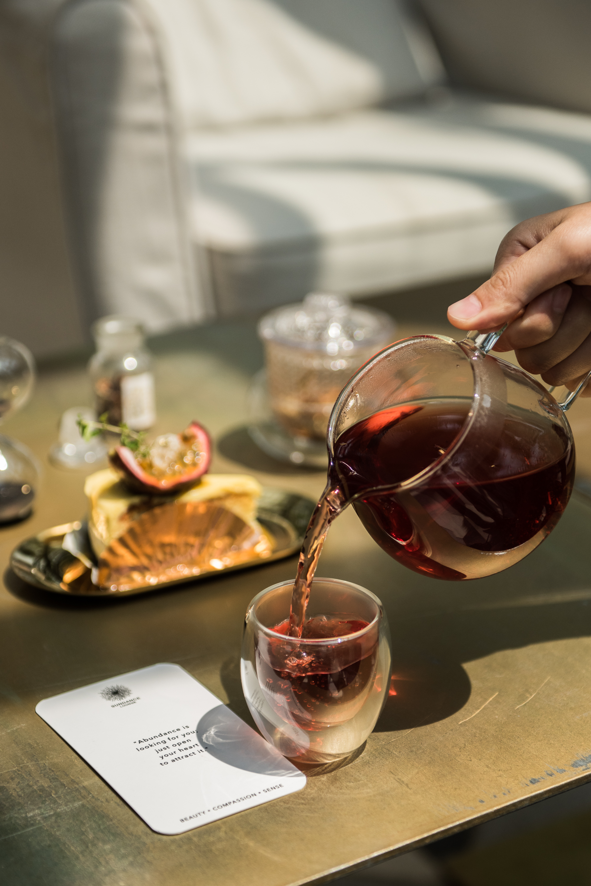 มาต่อกันที่คาเฟ่น้องใหม่ของ Seenspace Hua Hin อย่าง Sundance ห้องน้ำชาจากใบชาออร์แกนิคที่พิถีพิถันด้วยการส่งไปเบลนด์กลิ่นที่เยอรมัน จึงมากไปด้วยกลิ่นชาใหม่ ๆ ที่หลากหลาย อาทิ สมุนไพร เครื่องเทศ ผลไม้ และดอกไม้ ซึ่งเข้ากับคอนเซ็ปต์ที่ตกแต่งในบรรยากาศของกลาสเฮ้าส์ที่มีแสงแดดลอดผ่านต้นไม้ลงมากลางร้าน กระทบเข้ากับลูกบอลดิสโก้ จึงมีความระยิบระยับน่ามองคล้ายกับแสงแดดกำลังเต้นระบำ ใครที่มาถึงแล้วให้เริ่มต้นเลือกกลิ่นชาที่ชอบ ซึ่งแต่ละตัวจะมีไพ่ทาโร่ให้อ่านคำทำนาย เป็นคอนเซ็ปต์ที่ทางร้านอยากให้ทุกคนสนุกและประทับใจก่อนกลับบ้าน